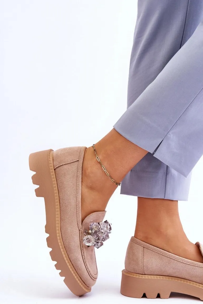 Modne Zamszowe Mokasyny Z Kryształkami Beżowe Demeris