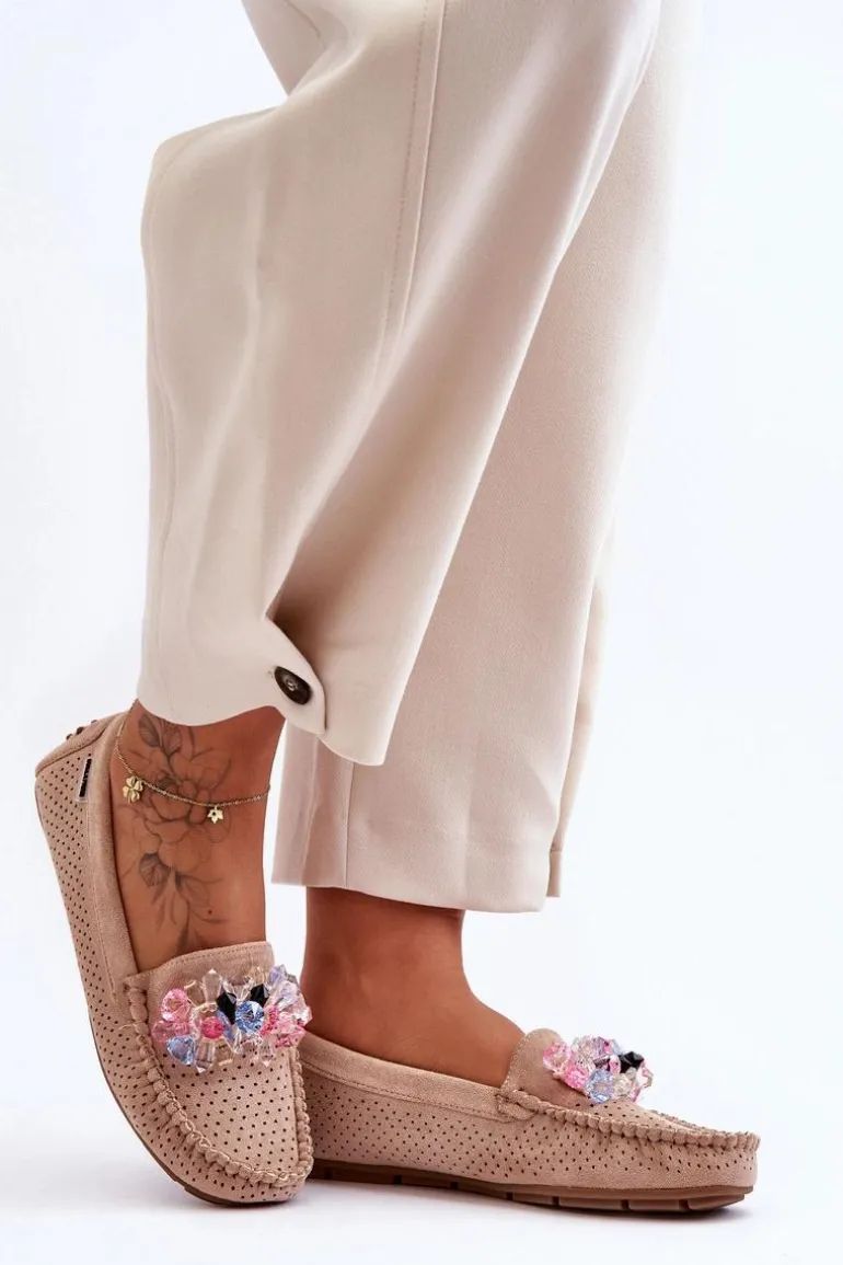 Modne Zamszowe Mokasyny Z Ozdobami Beżowe Delima