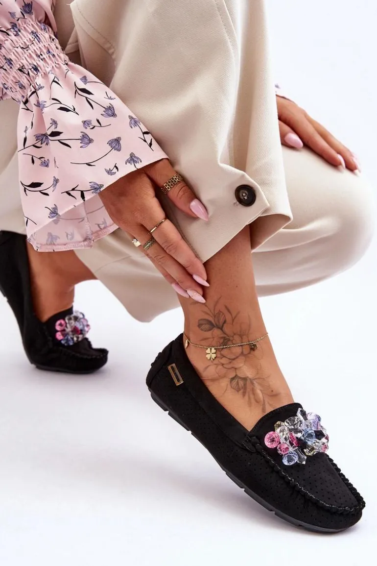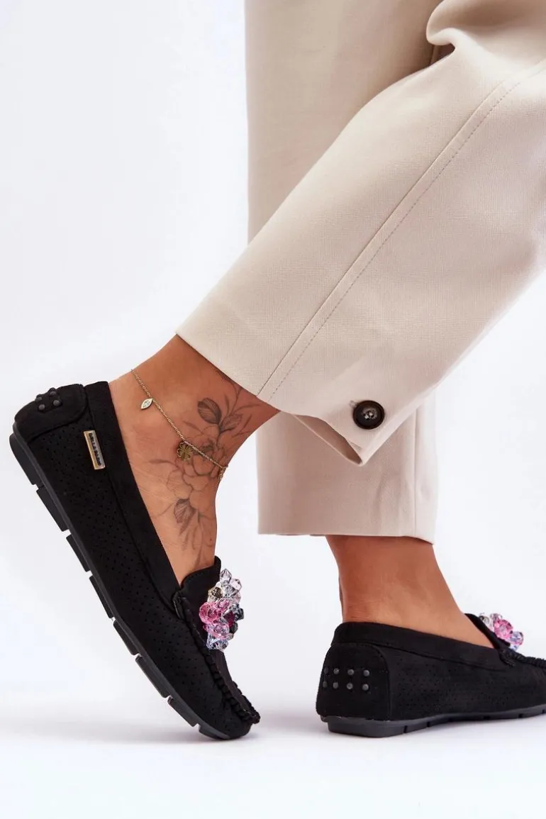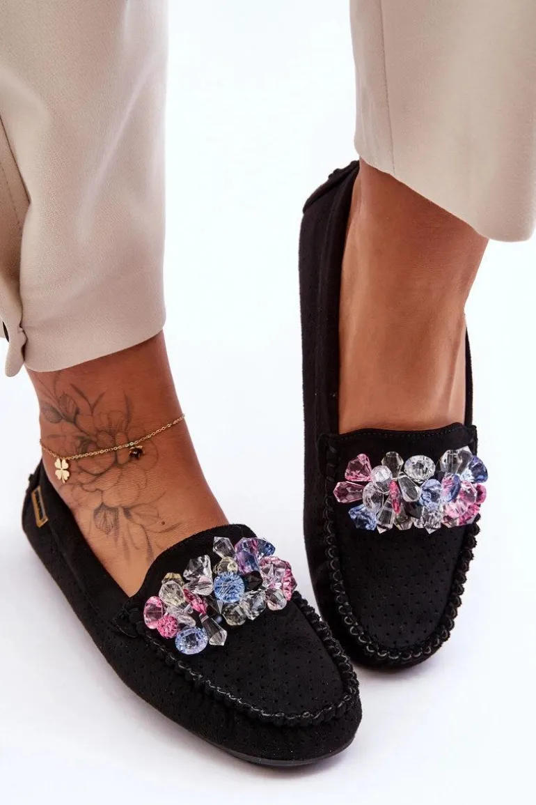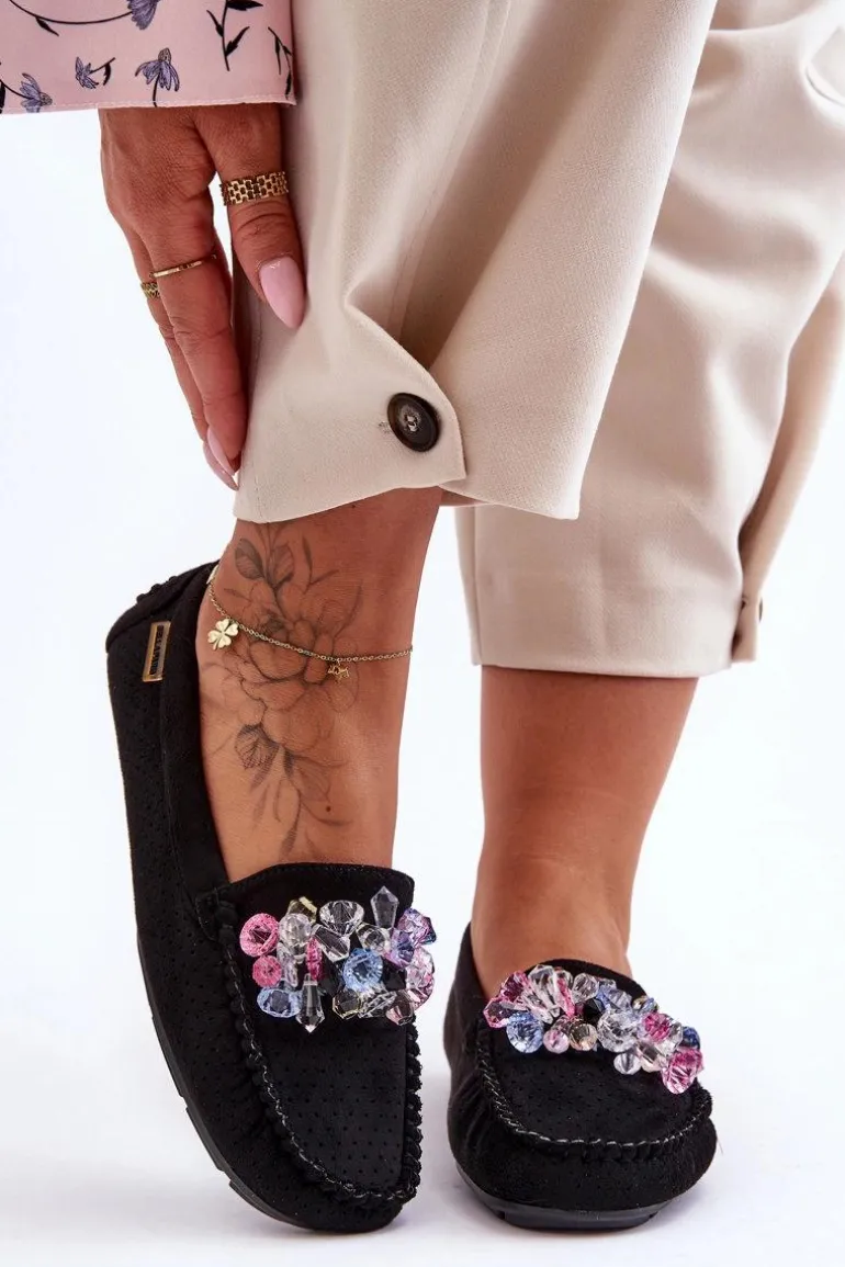 Te damskie mokasyny to HIT! Wykonane z miłego w dotyku eko zamszu z perforacją na całości cholewki. Na przodzie znajdują się ozdoby w postaci kolorowych kamieni. Mokasyny osadzono na antypoślizgowej, gumowej podeszwie. Miękka wkładka z naturalnej skóry i pianki zapewni komfort podczas użytkowania obuwia. Dodatkowo jest delikatnie perforowana. Przy wyborze rozmiaru prosimy sugerować się tabelą rozmiarów.
