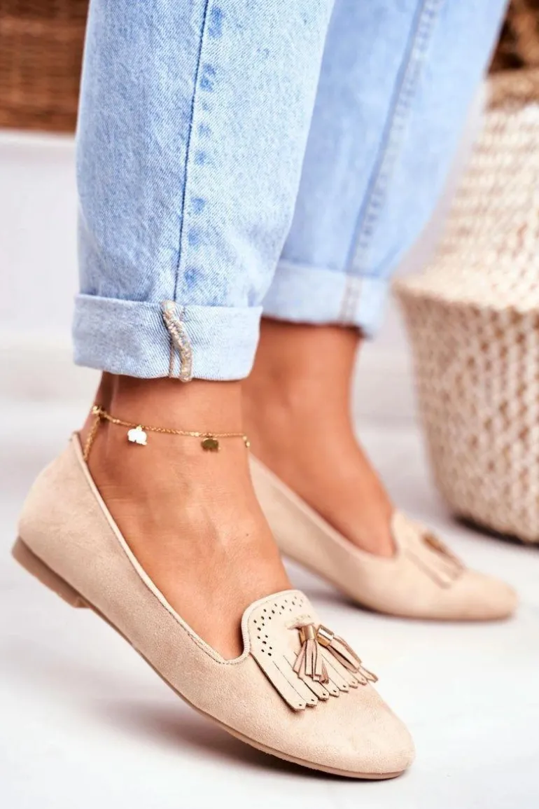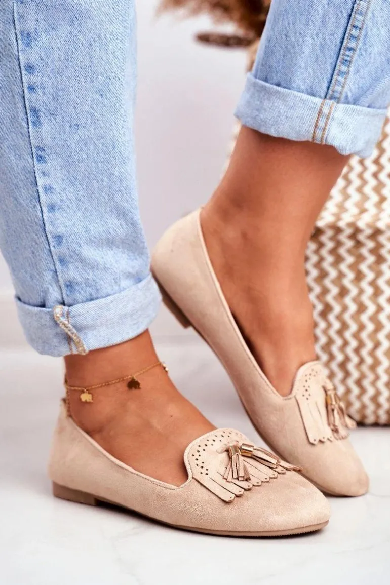 Mokasyny Damskie Beżowe Lordsy Frędzle Therese