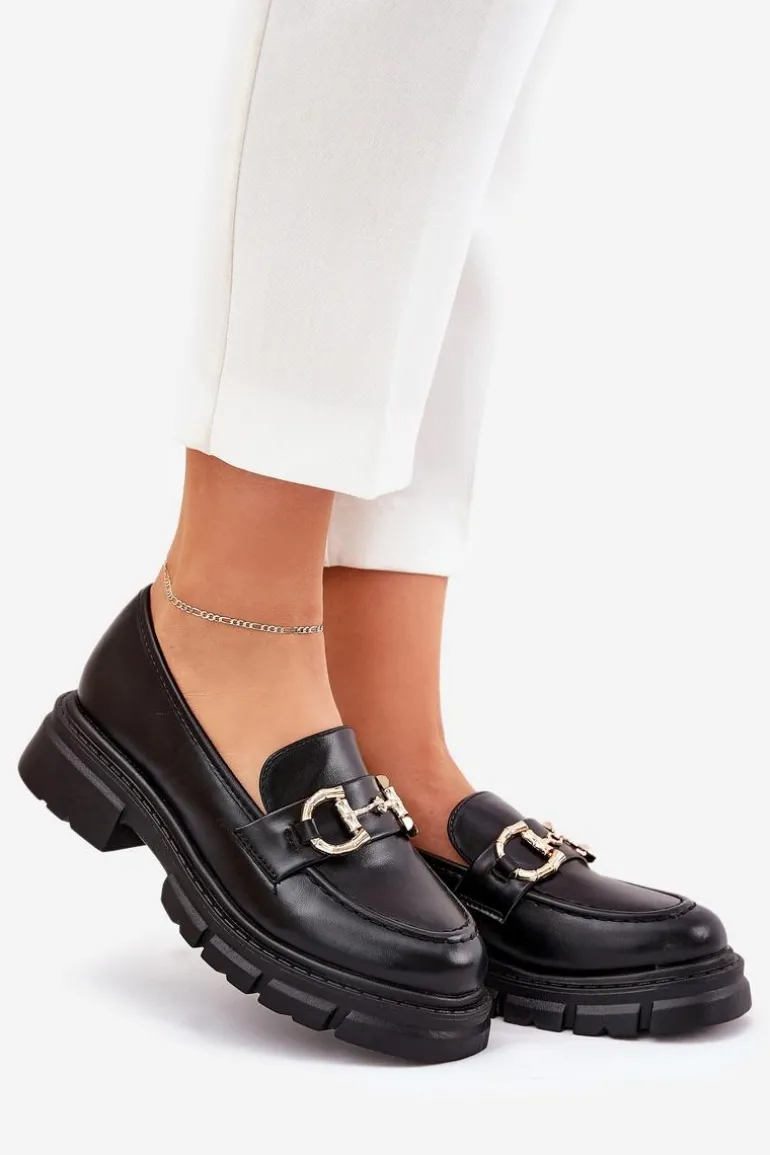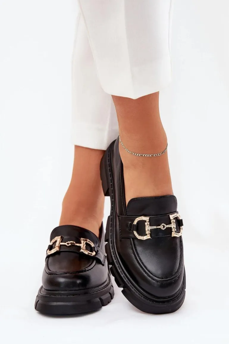 Stylowe mokasyny damskie wykonane z eko skóry. Noski zaokrąglone zapewniają wygodę przez cały dzień, a z przodu butów znajduje się ozdobny złoty detal, który dodaje im wyjątkowego charakteru. Osadzone na platformie i płaskim obcasie, te mokasyny oferują stabilność i lekkość. Idealne do codziennych stylizacji. Przy wyborze rozmiaru prosimy sugerować się tabelą rozmiarów.