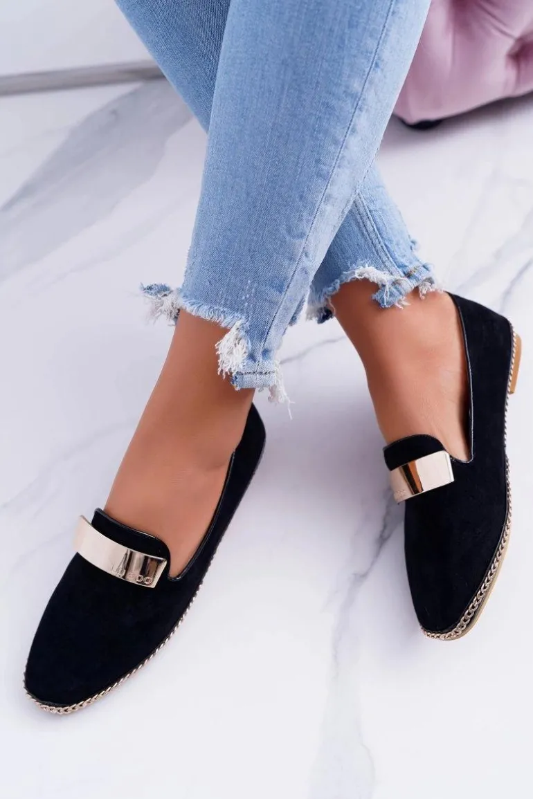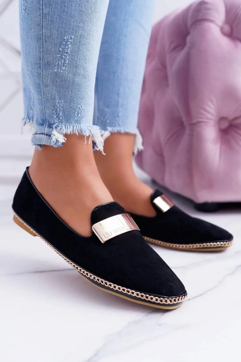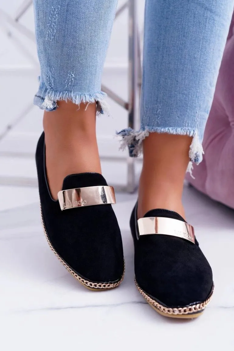 Mokasyny Damskie Lu Boo Czarne Złoty Łańcuch Panama