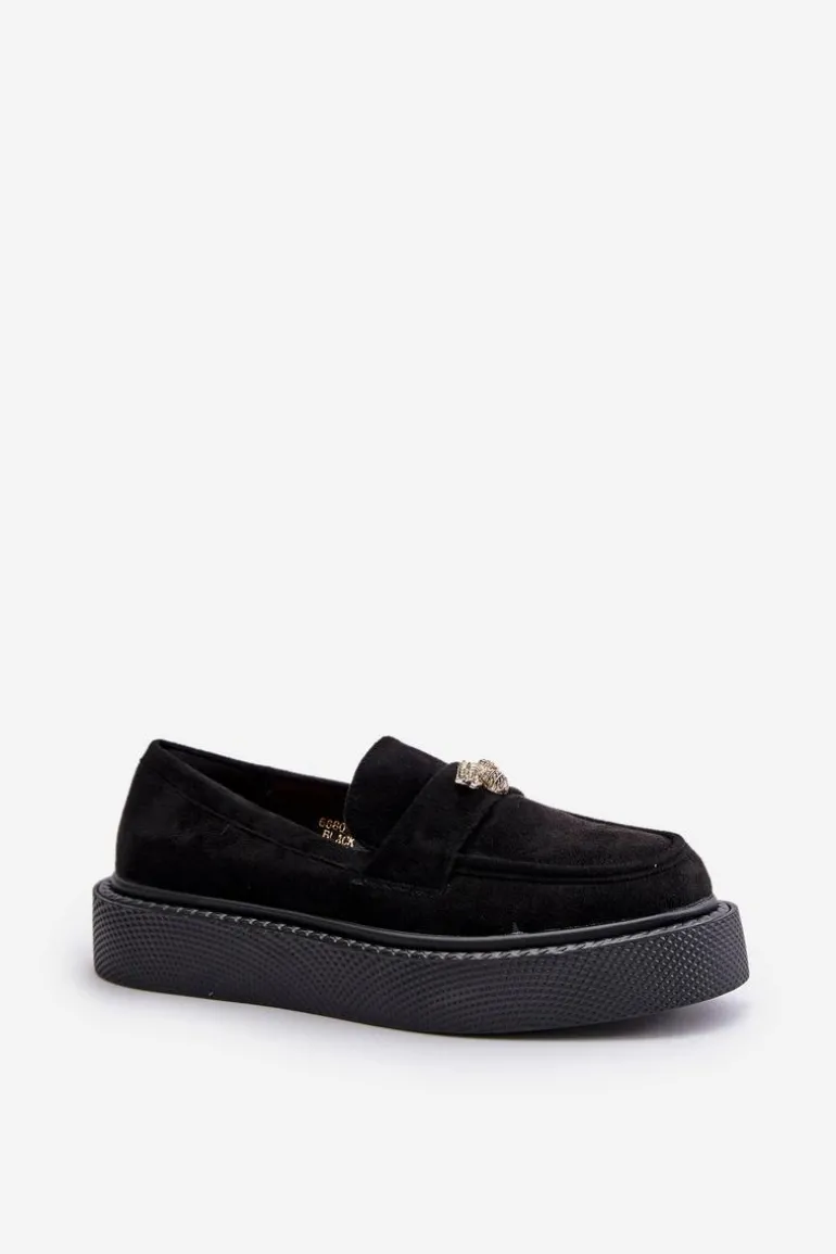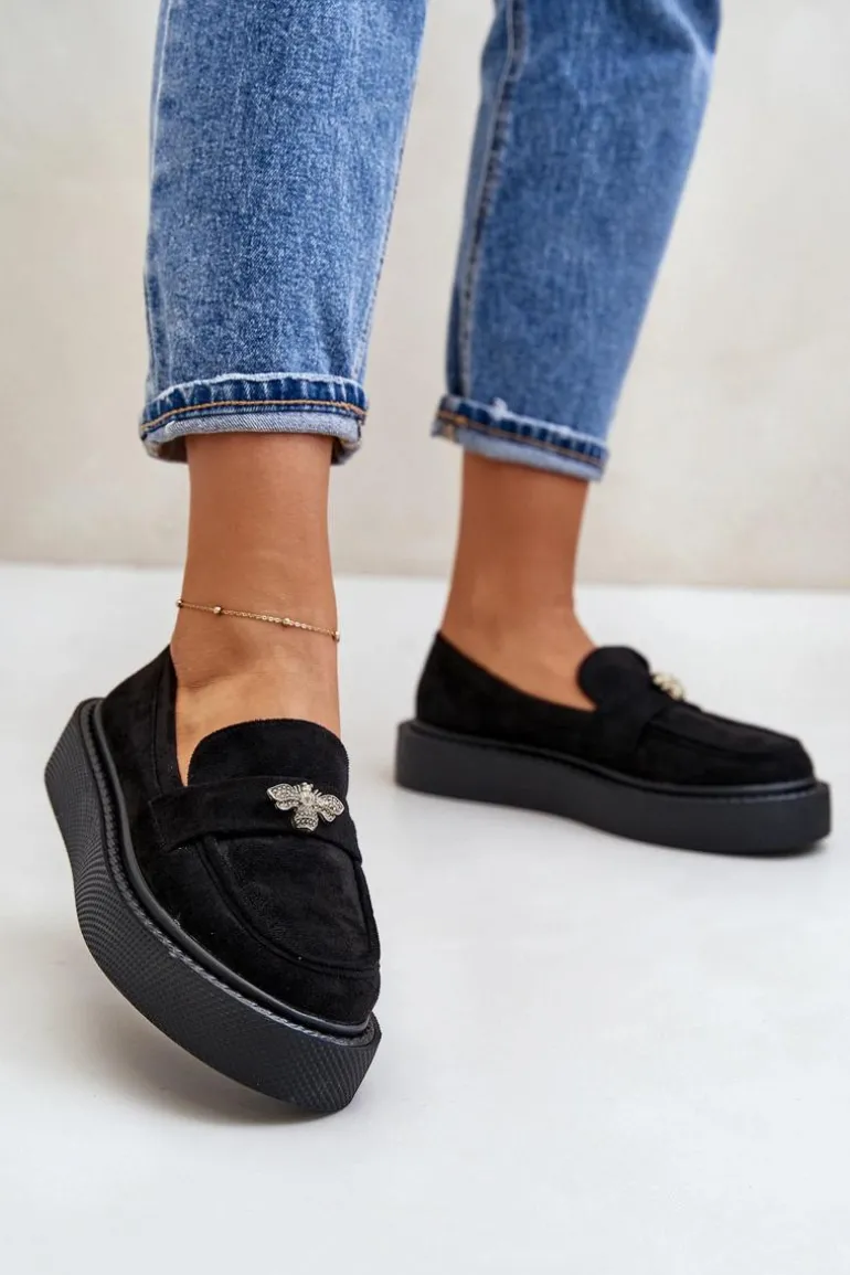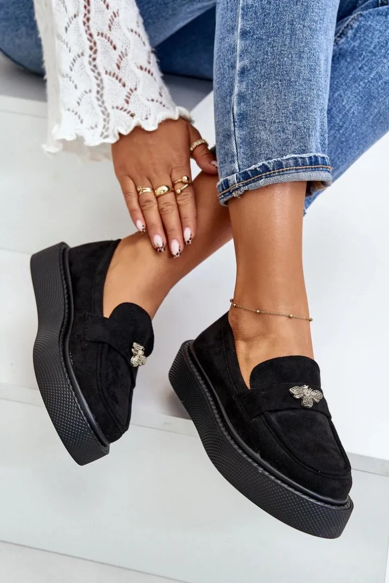 Stylowe mokasyny na platformie wykonane z eko zamszu. Z przodu ozdobione uroczą przypinką. Modne i wygodne, świetnie sprawdzą się w codziennych stylizacjach, zapewniając komfort noszenia przez cały dzień. Przy wyborze rozmiaru prosimy sugerować się tabelą rozmiarów.