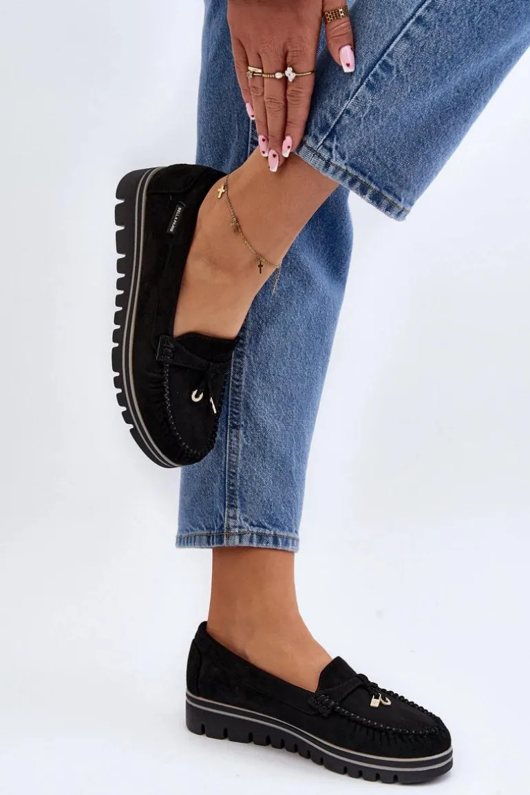 Mokasyny damskie wykonane z eko zamszu. Osadzone na platformie. Noski zaokrąglone. Model ten posiada miękką wkładkę ze skóry naturalnej, która zapewni wygodę podczas noszenia. Z przodu małe zawieszki. Klasyczny fason, który dopasujesz do wielu wiosenno-letnich stylizacji! Przy wyborze rozmiaru prosimy sugerować się tabelą rozmiarów.
