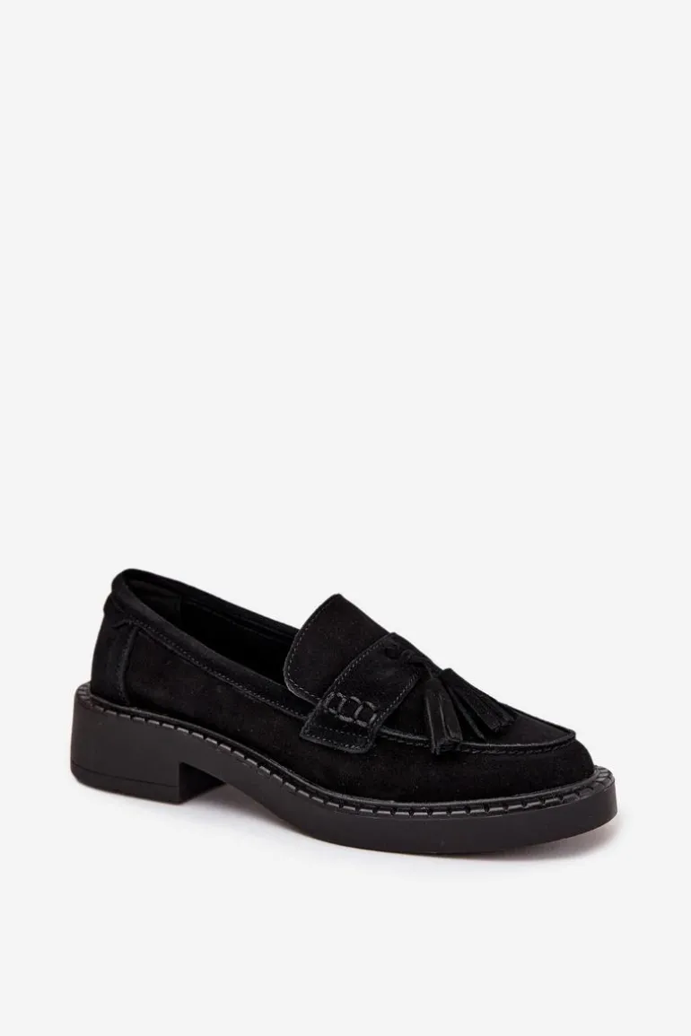 Mokasyny damskie wykonane z naturalnego zamszu. Osadzone na płaskim, stabilnym obcasie. Frędzle dodają im unikalnego uroku. Te mokasyny będą idealnym dopełnieniem wielu różnych stylizacji, zarówno casualowych, jak i bardziej eleganckich. Przy wyborze rozmiaru prosimy sugerować się tabelą rozmiarów.