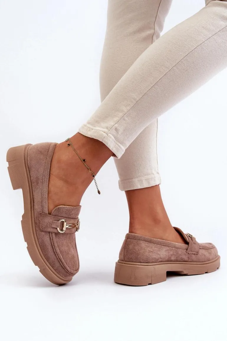 Modne damskie mokasyny wykonane z eko zamszu to absolutny must-have w Twojej garderobie! Przód ozdobiony paseczkiem ze złotą ozdobą, która dodaje im wyjątkowego uroku. Płaski obcas zapewnia wygodę noszenia przez cały dzień. Model ten będzie pasować do różnych stylizacji, dodając im elegancji! Przy wyborze rozmiaru prosimy sugerować się tabelą rozmiarów.