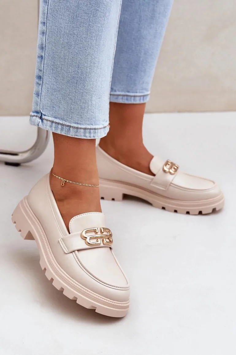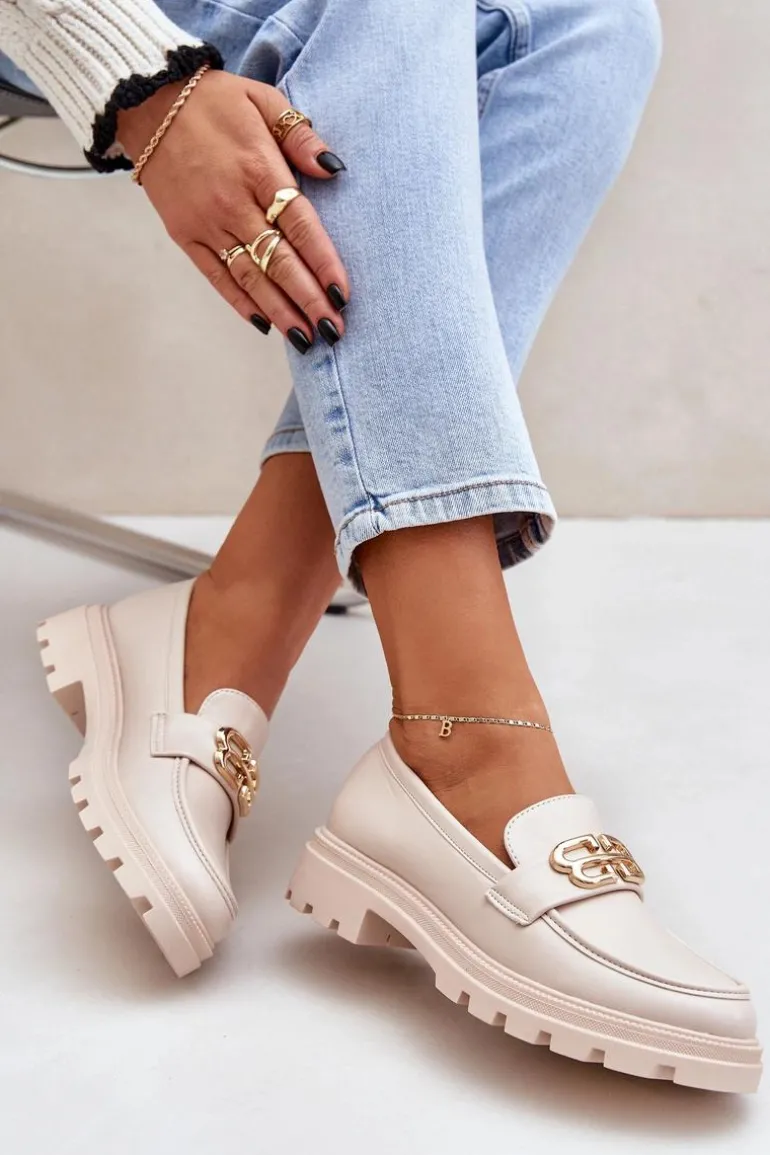 Mokasyny damskie wykonane z eko skóry. Osadzone na płaskim obcasie. Model ten wyróżnia się złotym detalem, który nadaje elegancji. Dzięki miękkiej wkładce mokasyny są wyjątkowo komfortowe, zapewniając wygodę noszenia przez cały dzień. Te mokasyny będą doskonałym wyborem dla kobiet, które cenią elegancki i jednocześnie praktyczny styl. Przy wyborze rozmiaru prosimy sugerować się tabelą rozmiarów.