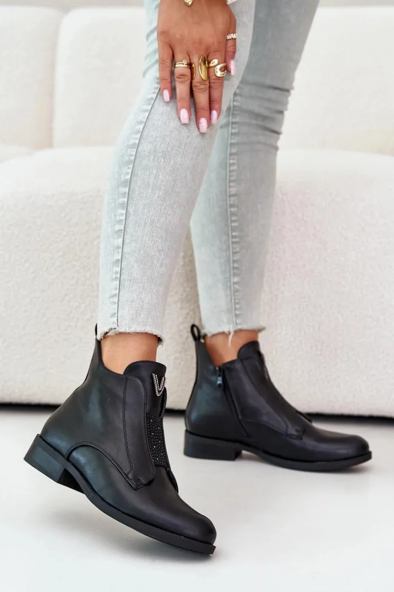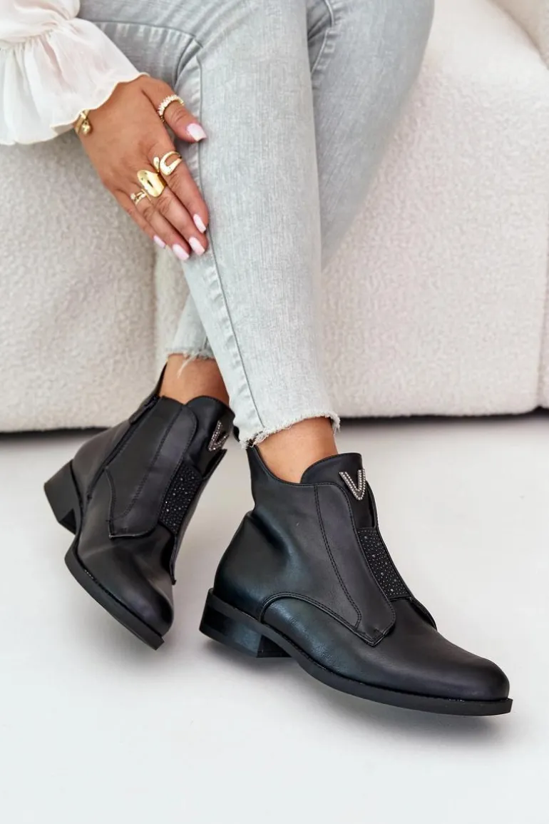 Botki damskie wykonane ze skóry ekologicznej. Osadzone na płaskim obcasie, który zapewni stabilność na każdym kroku. Środek ocieplony kocem obuwniczym. Noski zaokrąglone. Zapinane na zamek. Z przodu zdobiona, elastyczna wstawka oraz mały detal na języku. Cholewka za kostkę. Usztywniony zapiętek. Przy wyborze rozmiaru prosimy sugerować się tabelą rozmiarów.
