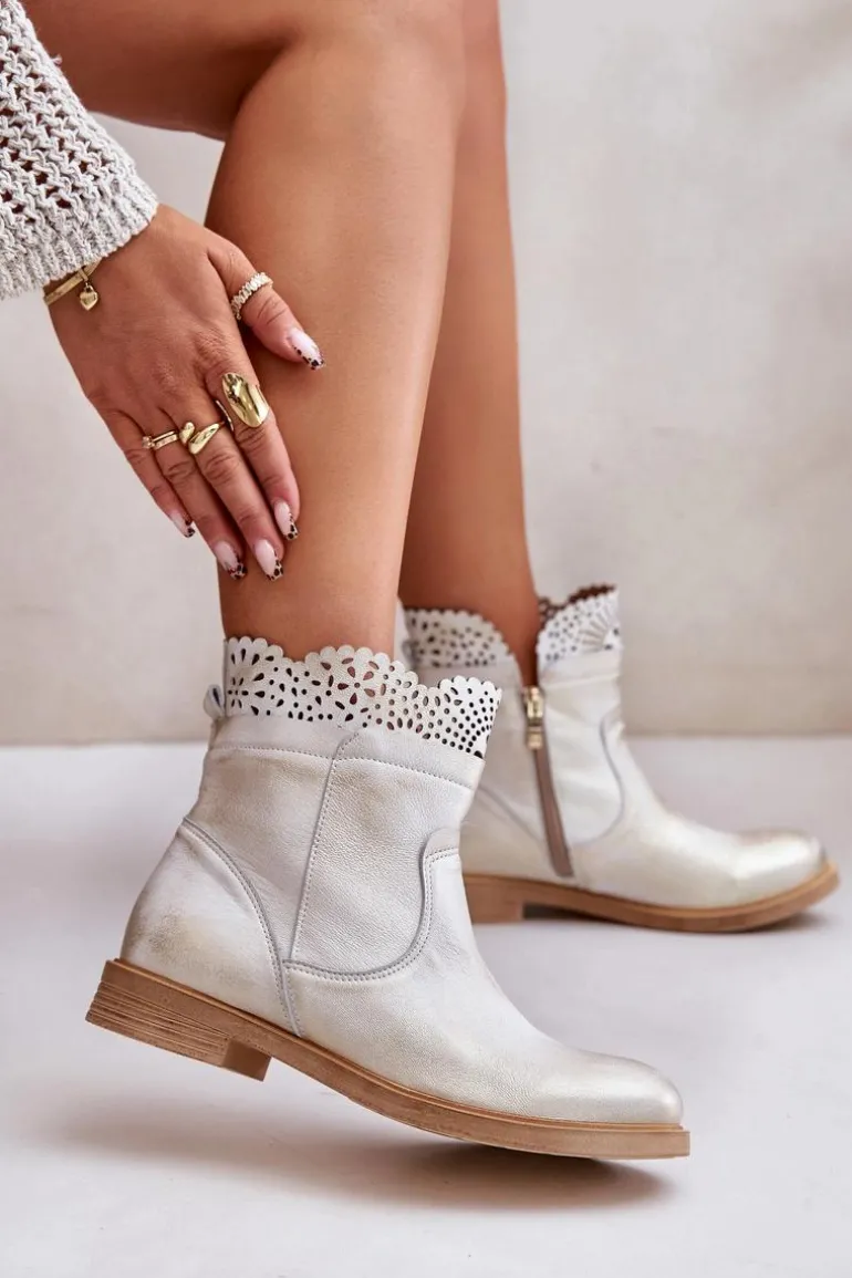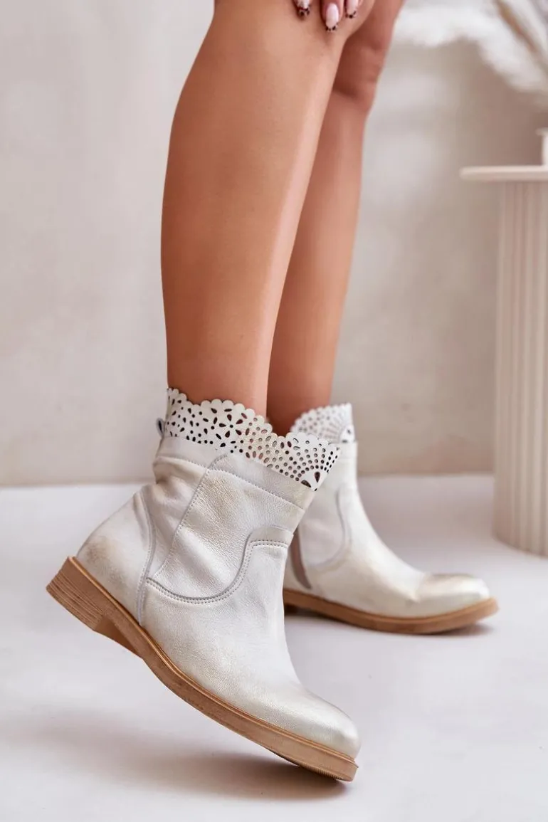 Te śliczne botki damskie zostały wykonane z wysokiej jakości naturalnej skóry. Osadzone na płaskim obcasie, co sprawia, że są niezwykle wygodne i stabilne. Zapinane na suwak z boku cholewki. Model ten posiada ażurowy element na górze cholewki. Noski zaokrąglone. Koniecznie powinnaś je mieć! Przy wyborze rozmiaru prosimy sugerować się tabelą rozmiarów.