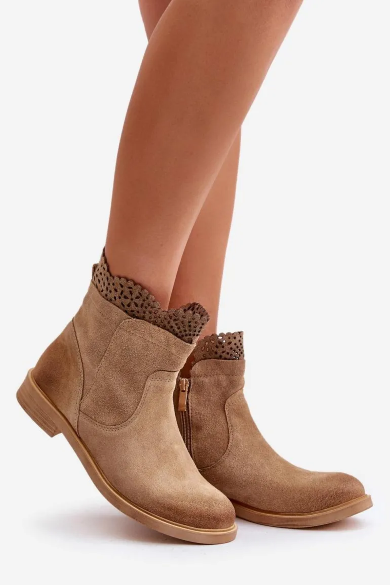 Te śliczne botki damskie zostały wykonane z wysokiej jakości naturalnego zamszu. Osadzone na płaskim obcasie, co sprawia, że są niezwykle wygodne i stabilne. Zapinane na suwak z boku cholewki. Model ten posiada ażurowy element na górze cholewki. Noski zaokrąglone. Koniecznie powinnaś je mieć! Przy wyborze rozmiaru prosimy sugerować się tabelą rozmiarów.