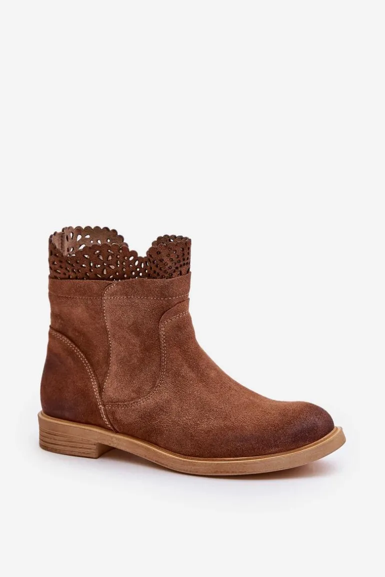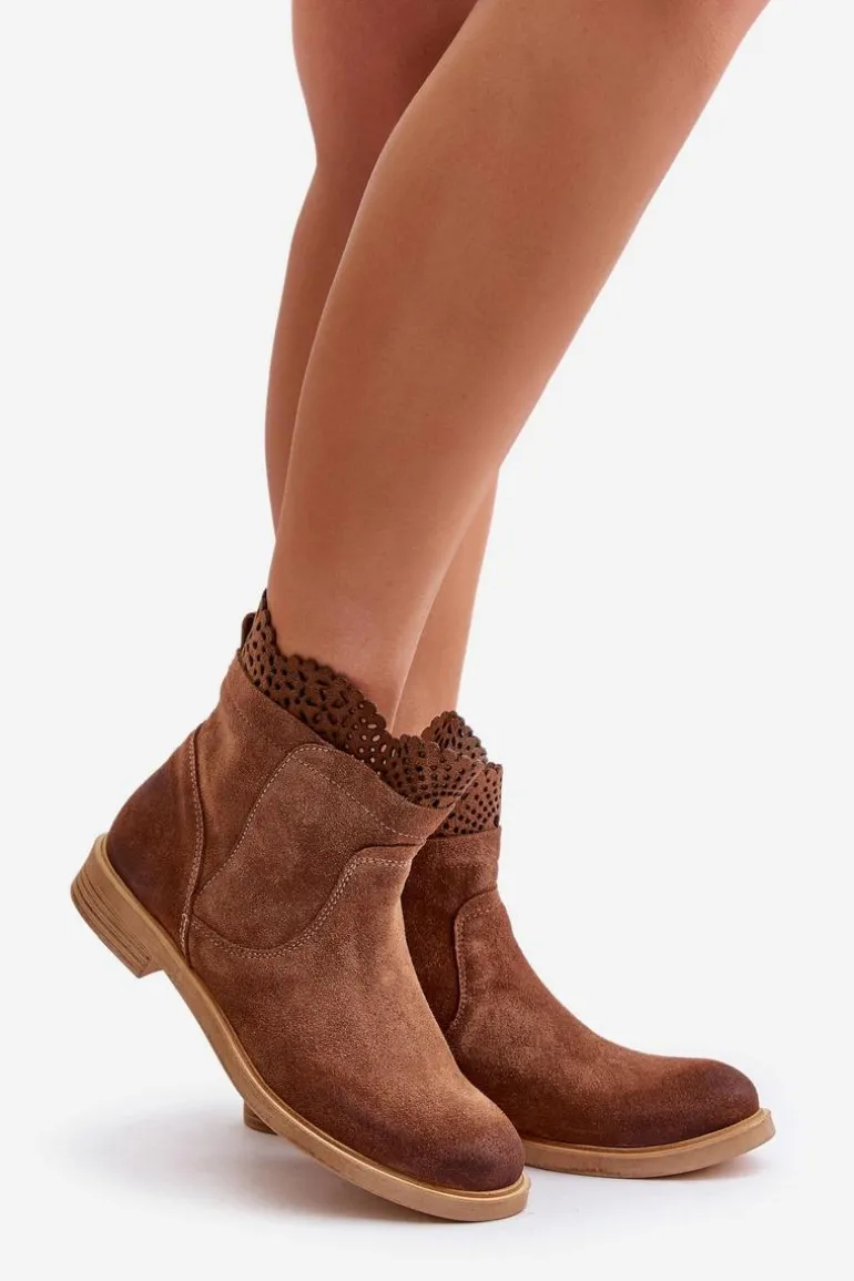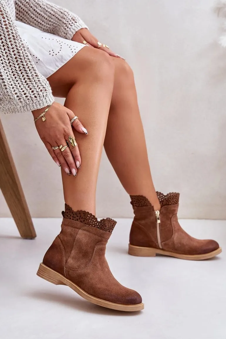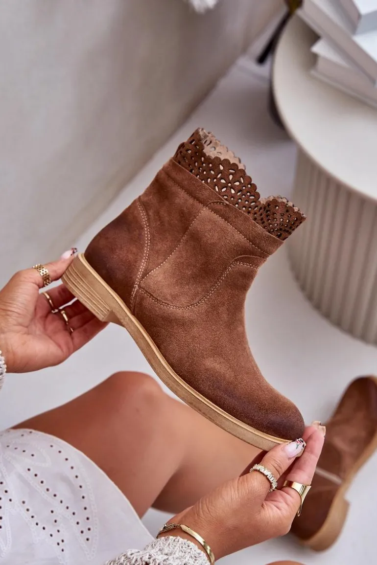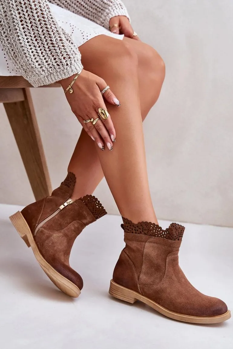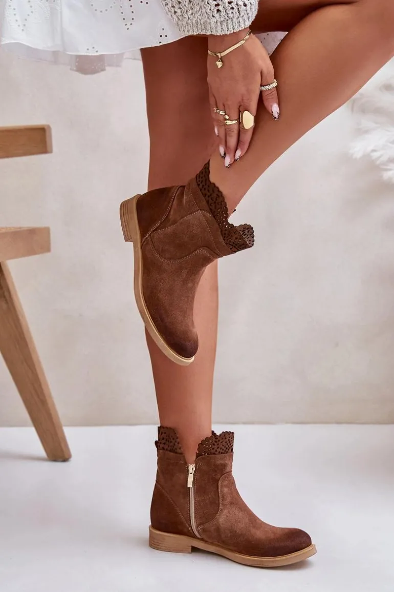 Te śliczne botki damskie zostały wykonane z wysokiej jakości naturalnego zamszu. Osadzone na płaskim obcasie, co sprawia, że są niezwykle wygodne i stabilne. Zapinane na suwak z boku cholewki. Model ten posiada ażurowy element na górze cholewki. Noski zaokrąglone. Koniecznie powinnaś je mieć! Przy wyborze rozmiaru prosimy sugerować się tabelą rozmiarów.