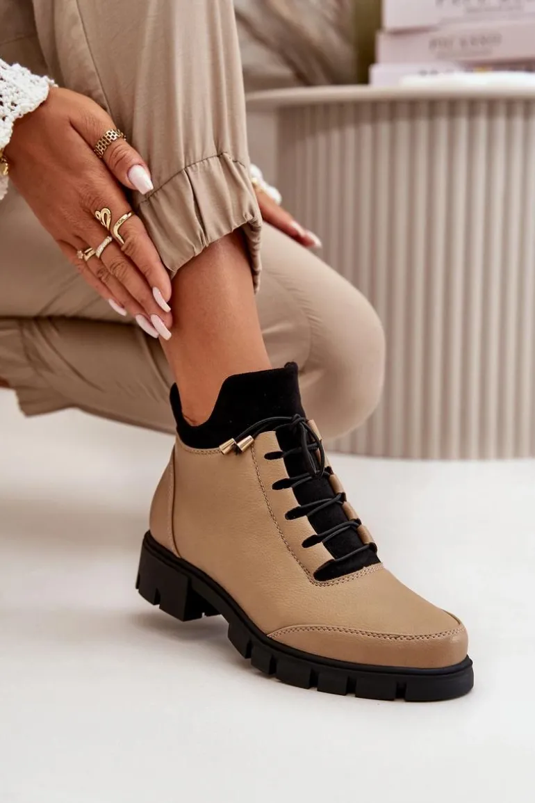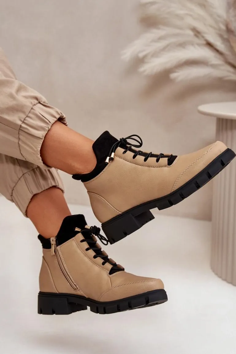 Botki damskie od marki Jezzi. Wykonane z eko skóry. Niska cholewka sięgająca za kostkę. Osadzone na płaskim obcasie. Zapinane na zamek oraz dodatkowo posiadają sznurowanie, co pozwala na idealne dopasowanie do stopy. Środek ocieplony miłym w dotyku kocem obuwniczym. Klasyczny fason do casualowych stylizacji! Przy wyborze rozmiaru prosimy sugerować się tabelą rozmiarów.