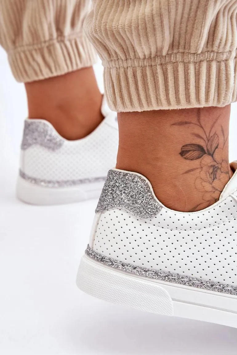 Klasyczne, damskie trampki zostały wzbogacone perforacją po bokach cholewki oraz brokatem. Wokół platformy znajduje się ozdobne przeszycie. Trampki posiadają miękką wkładkę, którą można wyjąć. Model ten posiada klasyczne sznurowanie. Idealne buty do codziennego użytkowania! Powinnaś je mieć! Przy wyborze rozmiaru prosimy sugerować się tabelą rozmiarów.
