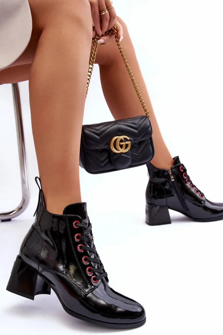 Botki damskie z niską cholewką wykonane z eko skóry. Osadzone na obcasie w postaci klocka. Noski w migdał. Środek ocieplony kocem obuwniczym. Model zapinany na suwak z boku oraz dodatkowo sznurowany. Miękka wkładka zapewni komfortowe użytkowanie obuwia. Zapiętek jest usztywniony. Przy wyborze rozmiaru prosimy sugerować się tabelą rozmiarów.
