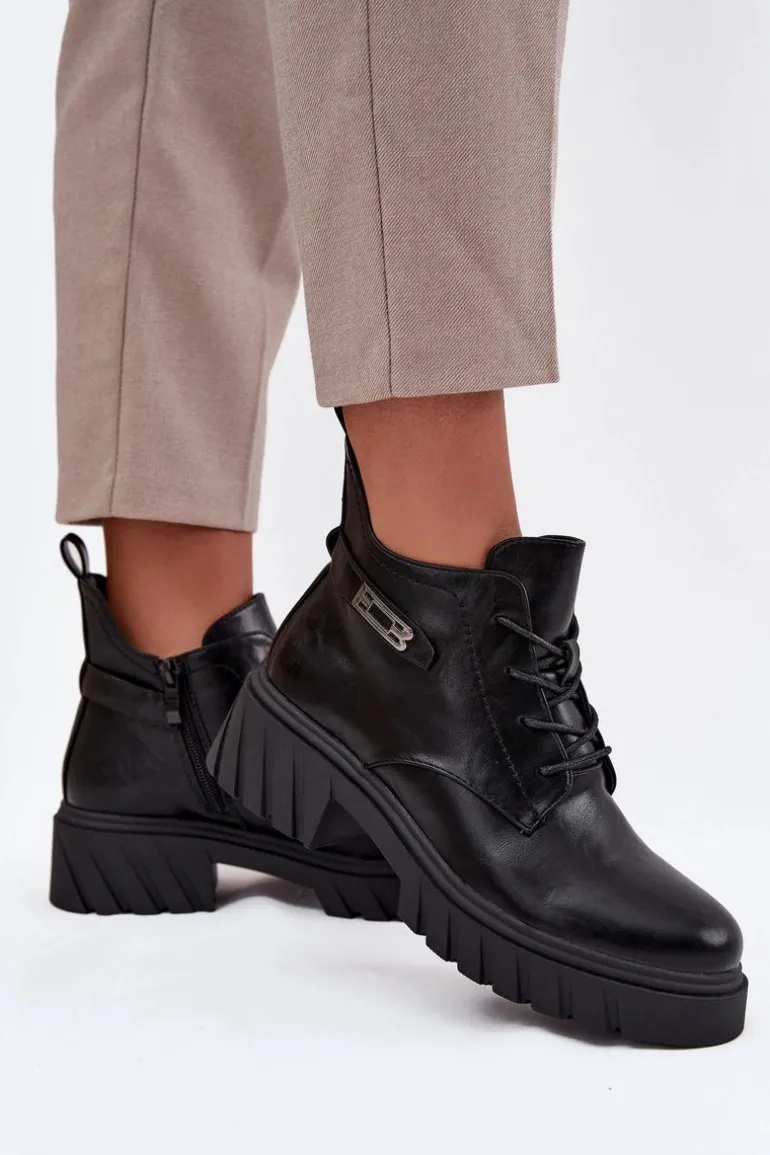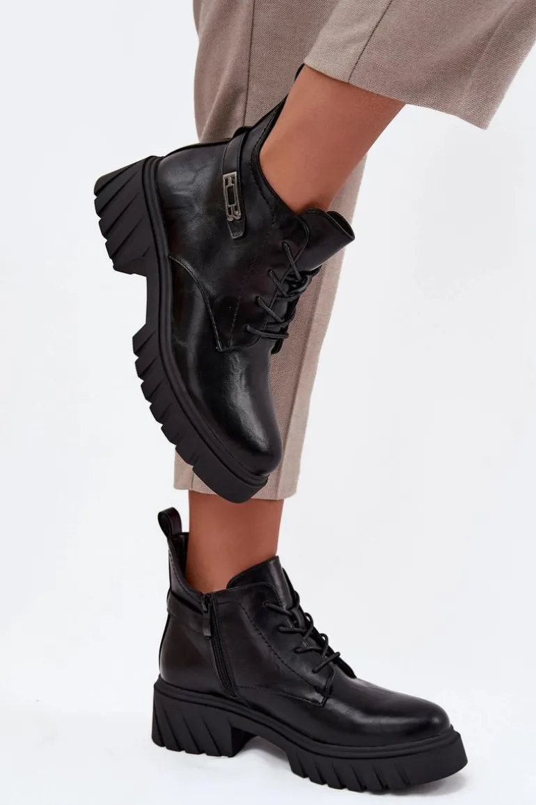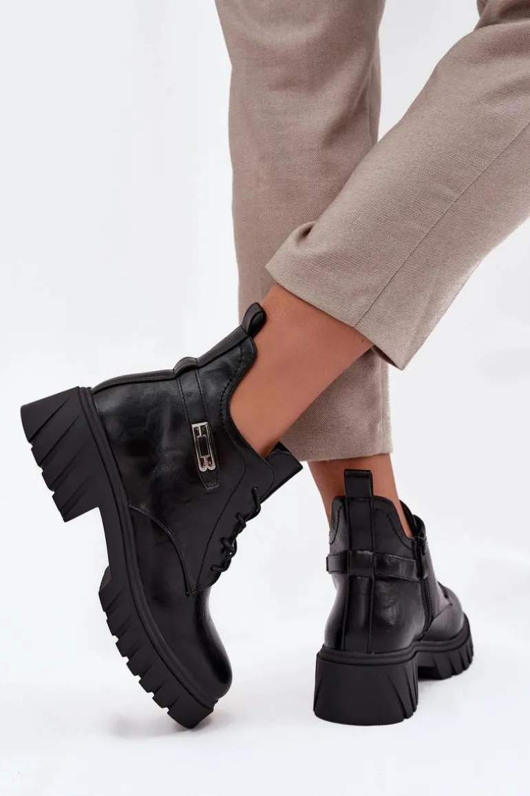 Niskie botki damskie od marki Jezzi wykonane z wysokiej jakości eko skóry to połączenie wygody i modnego wyglądu na co dzień. Osadzone na stabilnym obcasie typu klocek, zapewniają pewny krok i komfort noszenia przez cały dzień. Model łączy praktyczne sznurowanie z zamkiem błyskawicznym, co umożliwia szybkie zakładanie i idealne dopasowanie do stopy. Na cholewce znajduje się subtelny, ozdobny paseczek, który dodaje eleganckiego akcentu, sprawiając, że świetnie komponują się zarówno z casualowymi, jak i bardziej formalnymi outfitami. Przy wyborze rozmiaru prosimy sugerować się tabelą rozmiarów.
