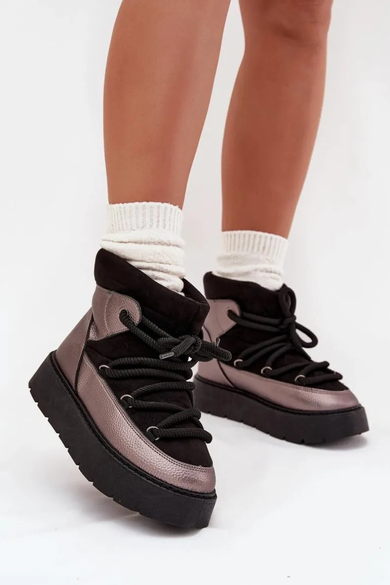 Damskie niskie śniegowce wykonane z połączenia eko zamszu i eko skóry to świetny wybór na zimowe dni. Osadzone na platformie, zapewniają komfort i stabilność, a grube wiązanie z przodu dodaje im charakteru. Środek ocieplony grubym futerkiem gwarantuje ciepło nawet w najbardziej mroźne dni. Idealne na zimowe wyjazdy, spacery czy codzienne stylizacje, te śniegowce łączą funkcjonalność z modnym wyglądem. Przy wyborze rozmiaru prosimy sugerować się tabelą rozmiarów.