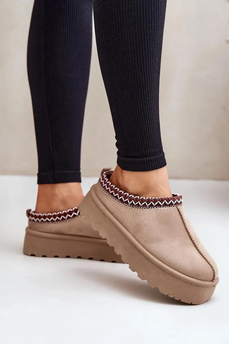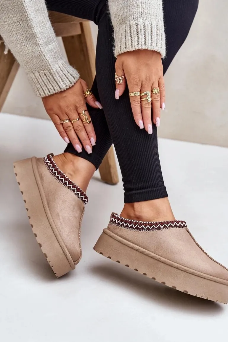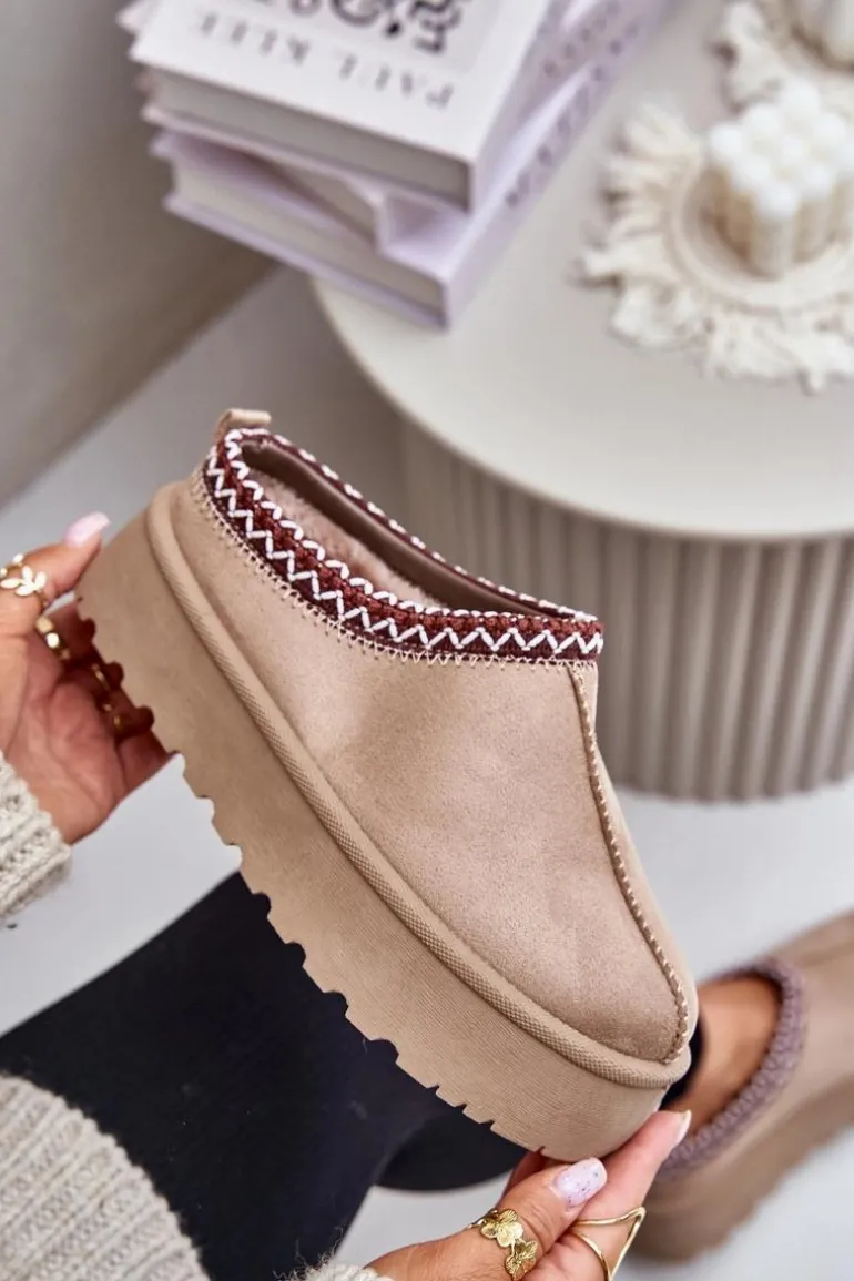 Damskie śniegowce ozdobione dekoracyjną lamówką. Wykonane z ekologicznego zamszu, są doskonałym wyborem na chłodniejsze dni. Osadzone na platformie, oferują nie tylko stylowy wygląd, ale także komfort oraz ochronę przed zimnem. Wnętrze butów ocieplane jest miękkim futerkiem, co zapewnia ciepło i wygodę podczas użytkowania. Te śniegowce stanowią idealne połączenie funkcjonalności i eleganckiego wyglądu, idealne na zimowe spacery. Przy wyborze rozmiaru prosimy kierować tabelą rozmiarów.