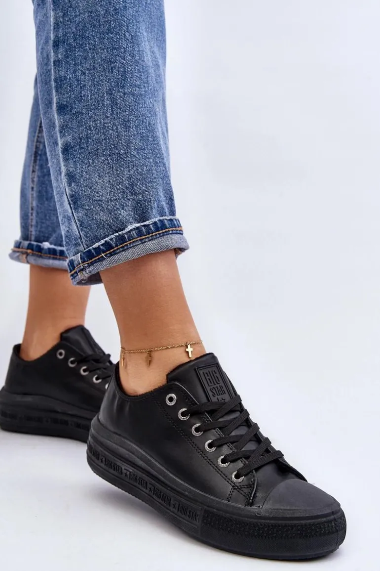Damskie trampki od marki BIG STAR z niską cholewką. Wykonane z eko skóry. Model klasycznie sznurowany. Osadzone na grubej podeszwie z gumowego tworzywa. Środek lekko ocieplony futerkiem. Koniecznie sprawdź całą naszą kolekcję butów marki BIG STAR. Przy wyborze rozmiaru prosimy sugerować się tabelą rozmiarów.