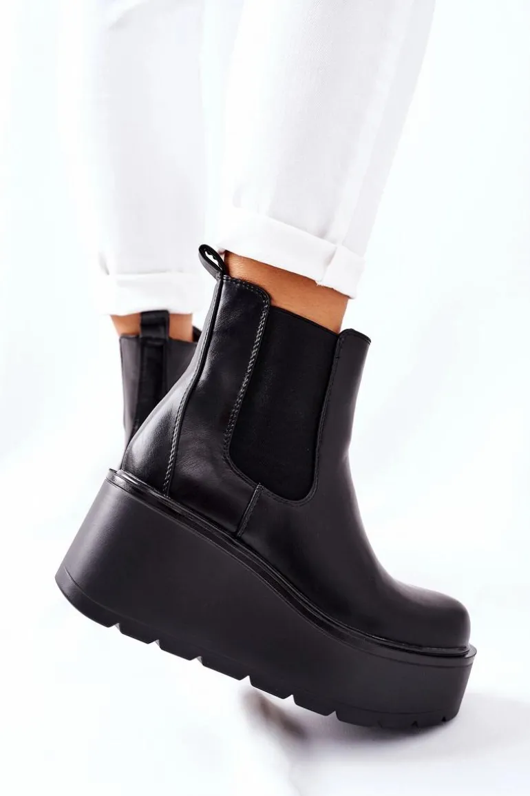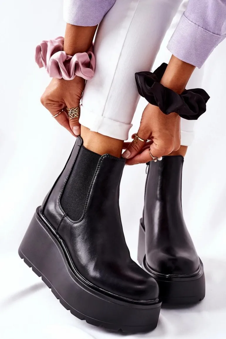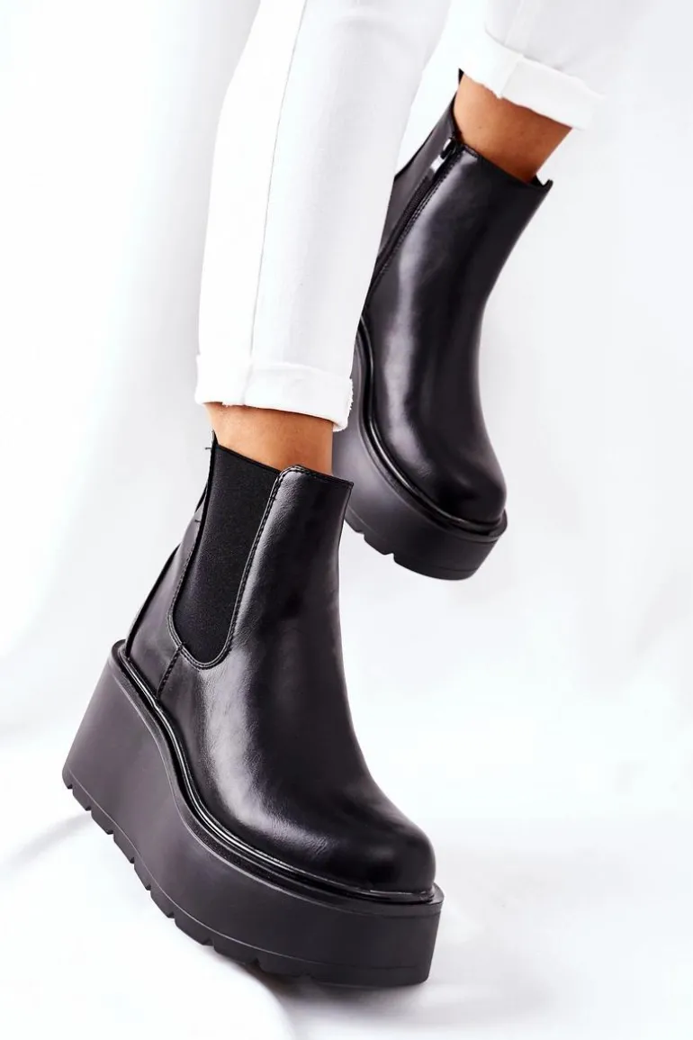 Botki damskie wykonane z eko skóry. Wnętrze botków ocieplone jest miłym w dotyku kocem obuwniczym. Wysoka platforma. Przy wyborze rozmiaru prosimy sugerować się tabelą rozmiarów.