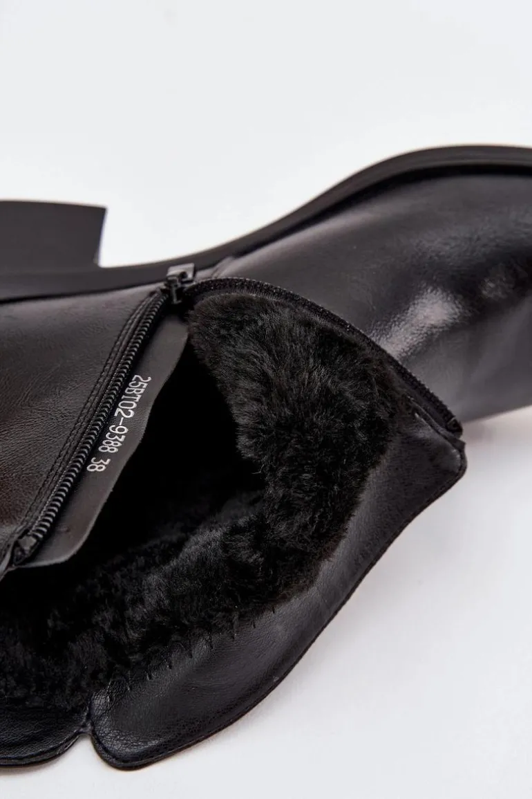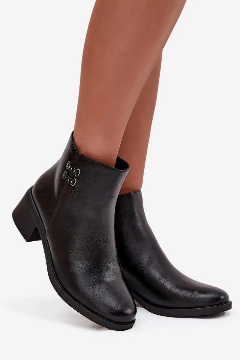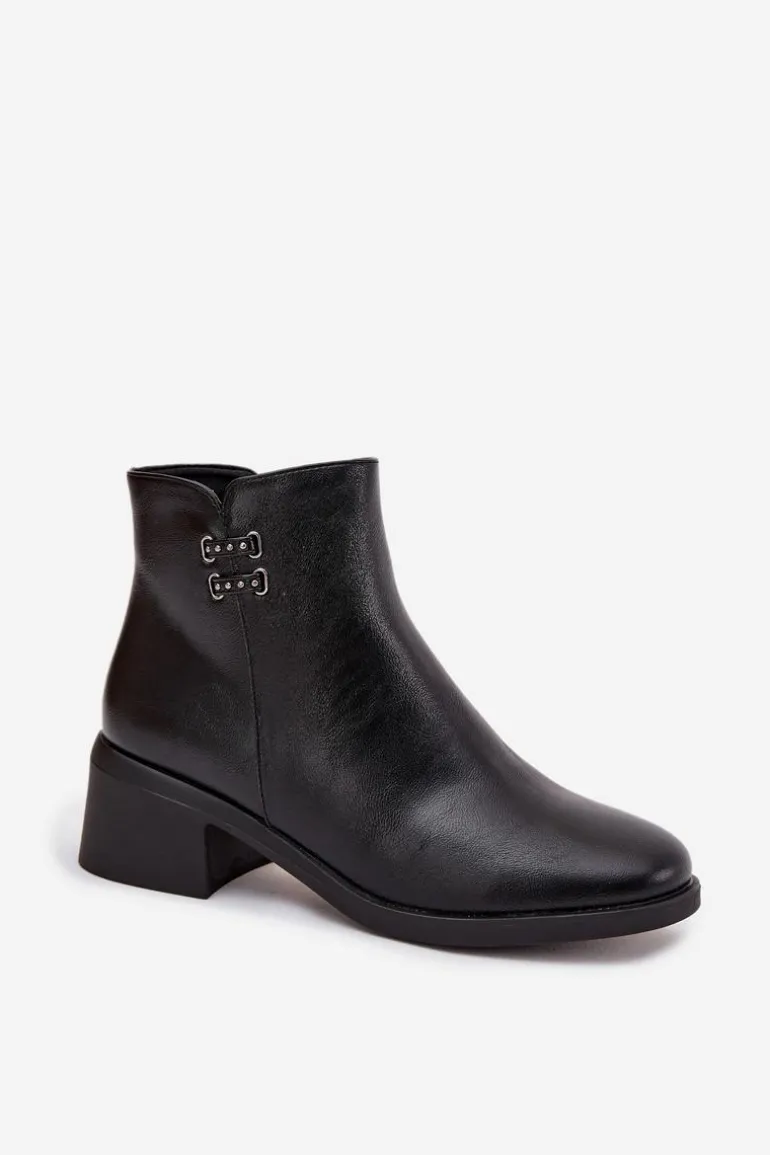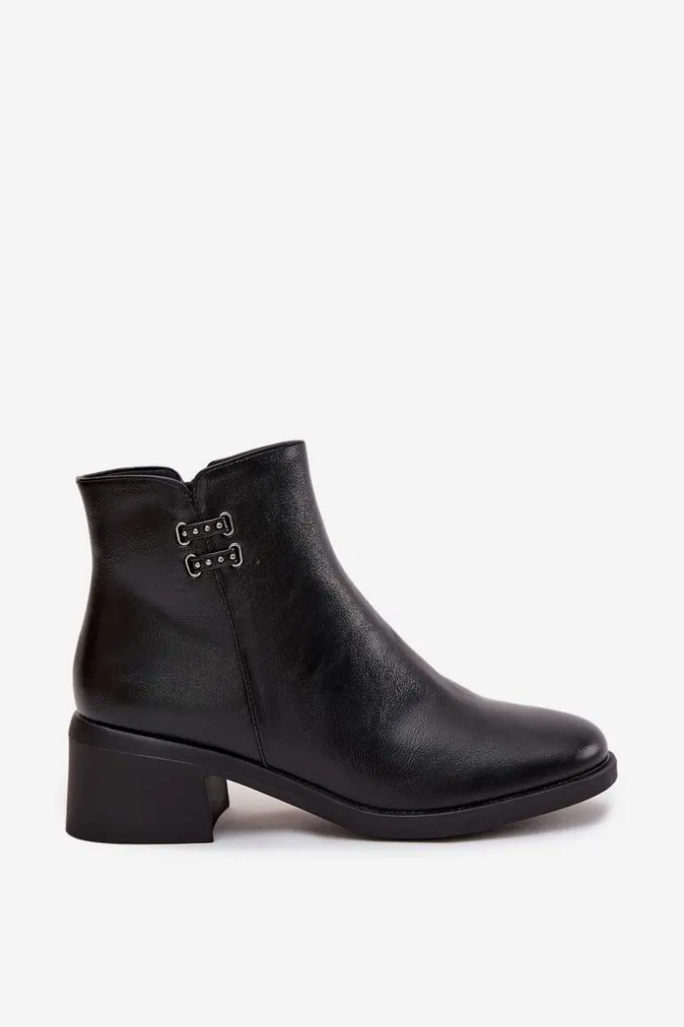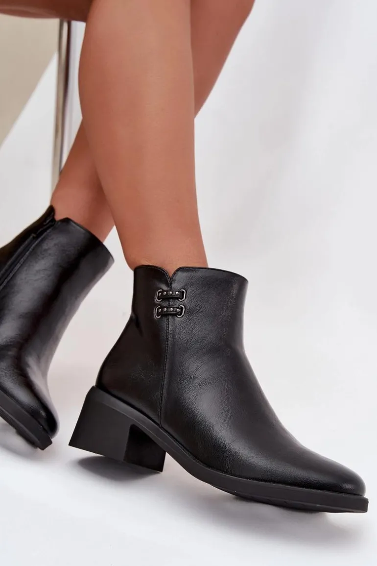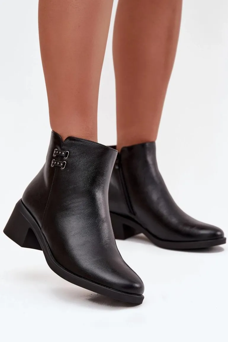 Botki damskie z eko skóry to wygodna i stylowa propozycja na chłodniejsze dni. Osadzone na obcasie w formie klocka, zapewniają stabilność i komfort noszenia, a zaokrąglone noski nadają im klasycznego charakteru. Zapinane na zamek, są praktyczne i łatwe w zakładaniu. Wnętrze zostało ocieplone miękkim futerkiem, które gwarantuje ciepło i wygodę. Dodatkowego uroku dodają im dwa krótkie ozdobne paseczki umieszczone na górze cholewki.