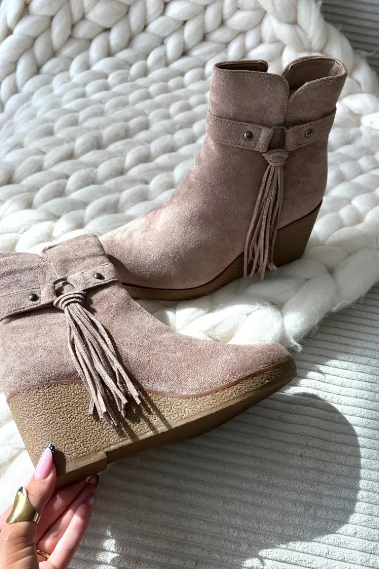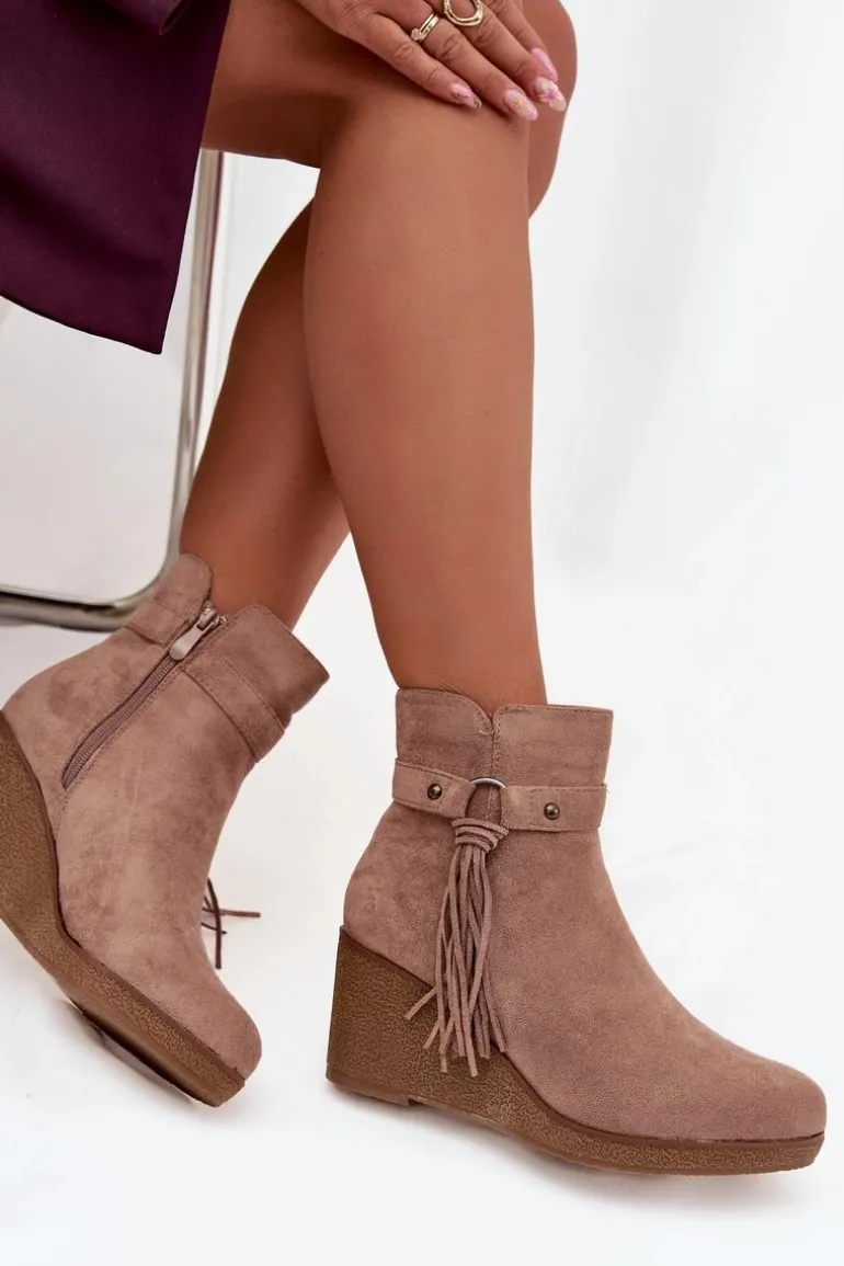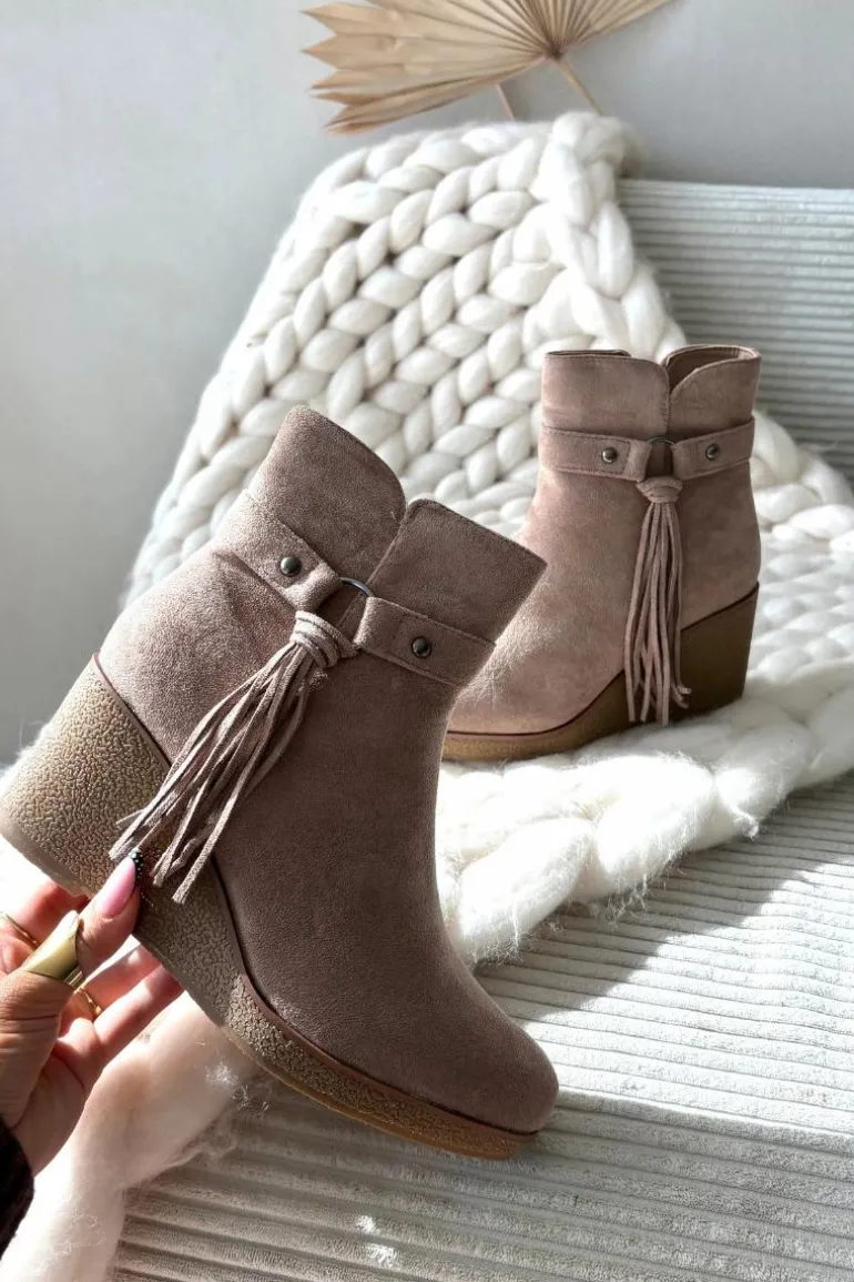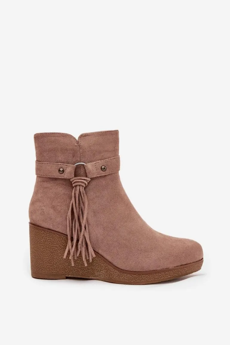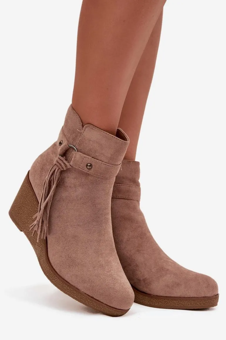 Botki damskie z eko zamszu to modny i wygodny wybór na chłodniejsze dni. Wnętrze butów zostało ocieplone kocem obuwniczym, dzięki czemu zapewniają komfort i ciepło. Zamek po boku ułatwia zakładanie i zdejmowanie, a całości wyjątkowego charakteru nadaje ozdobny pasek z frędzlami, który podkreśla stylowy wygląd modelu. To obuwie doskonale sprawdzi się w codziennych stylizacjach – pasuje zarówno do spodni, jak i do sukienek czy spódnic, dodając im modnego akcentu.