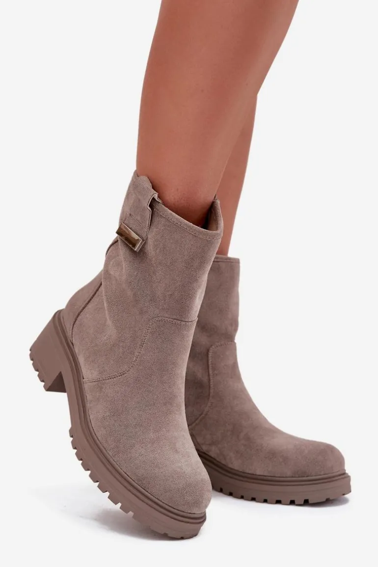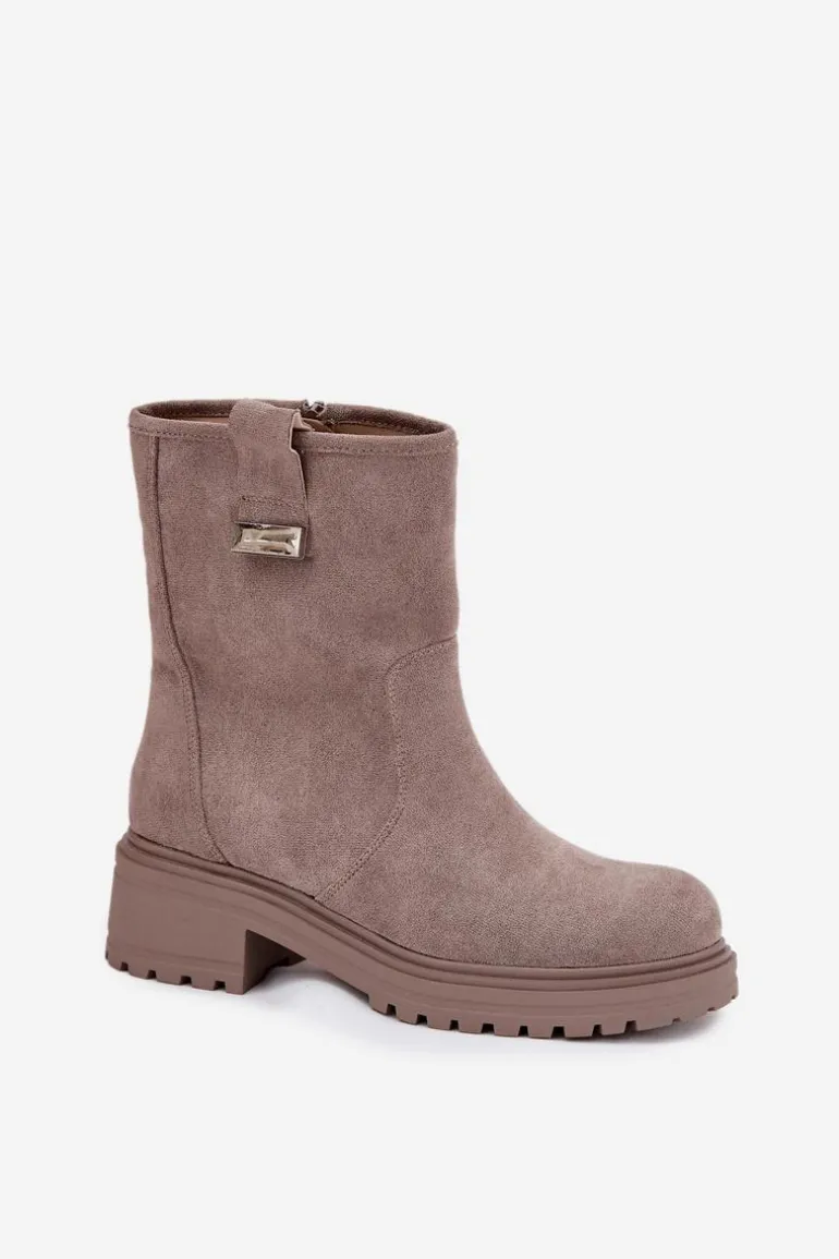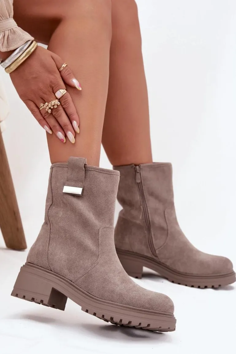 Botki damskie wykonane z eko zamszu. Osadzone na niskim obcasie, zapewniają komfort przy każdym kroku, a wnętrze ocieplane kocem obuwniczym gwarantuje ciepło. Model zapinany na zamek ułatwia szybkie zakładanie, a ozdobny, krótki pasek na górze cholewki dodaje subtelnego, stylowego akcentu, który podkreśla codzienne stylizacje. Przy wyborze rozmiaru prosimy sugerować się tabelą rozmiarów.