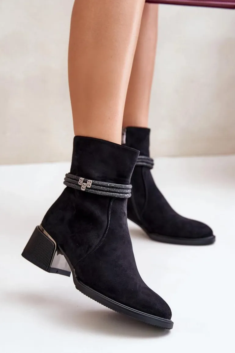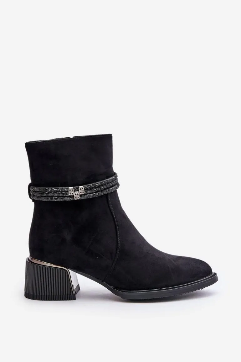 Botki damskie wykonane z wysokiej jakości eko zamszu. Osadzone na niskim obcasie. Noski w migdał. Środek ocieplany kocem obuwniczym. Zapinane na zamek. Głównym atutem tego modelu są błyszczące paseczki na cholewce. Przy wyborze rozmiaru prosimy sugerować się tabelą rozmiarów.