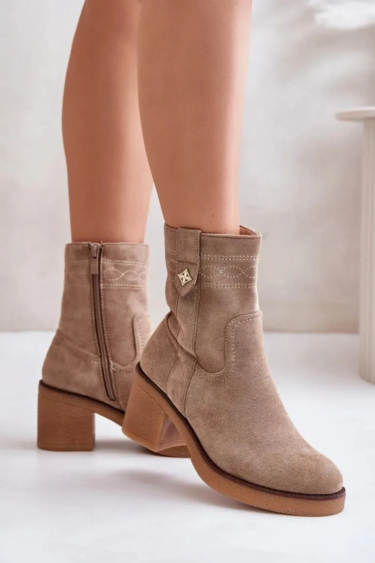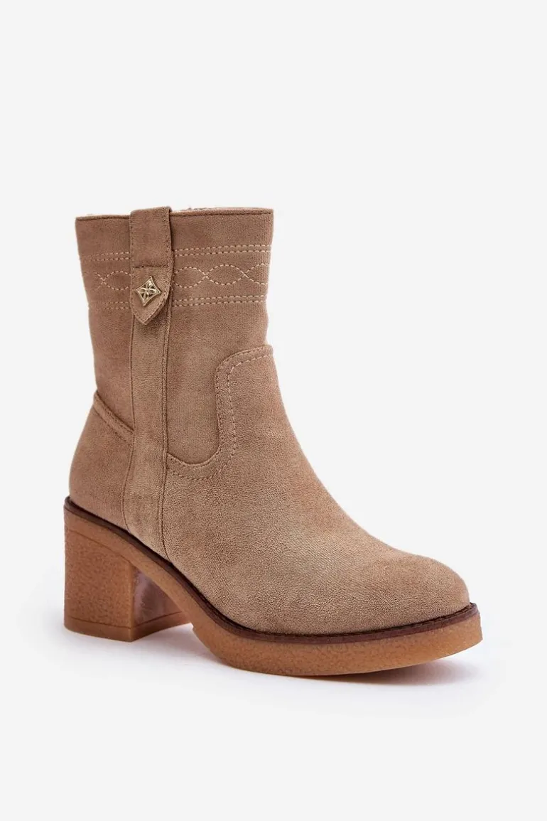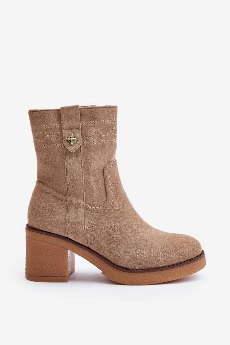 Klasyczne botki damskie wykonane z eko zamszu. Osadzone na obcasie w formie słupka. Noski zaokrąglone. Model ten wyróżnia się przeszyciami na cholewce oraz małym detalem. Wnętrze ocieplane miękkim kocem obuwniczym, idealne na chłodniejsze dni. Przy wyborze rozmiaru prosimy sugerować się tabelą rozmiarów.