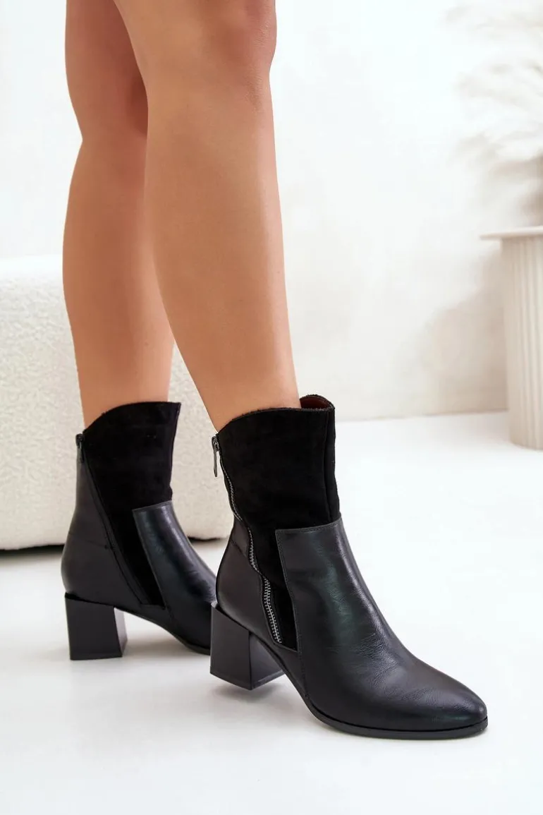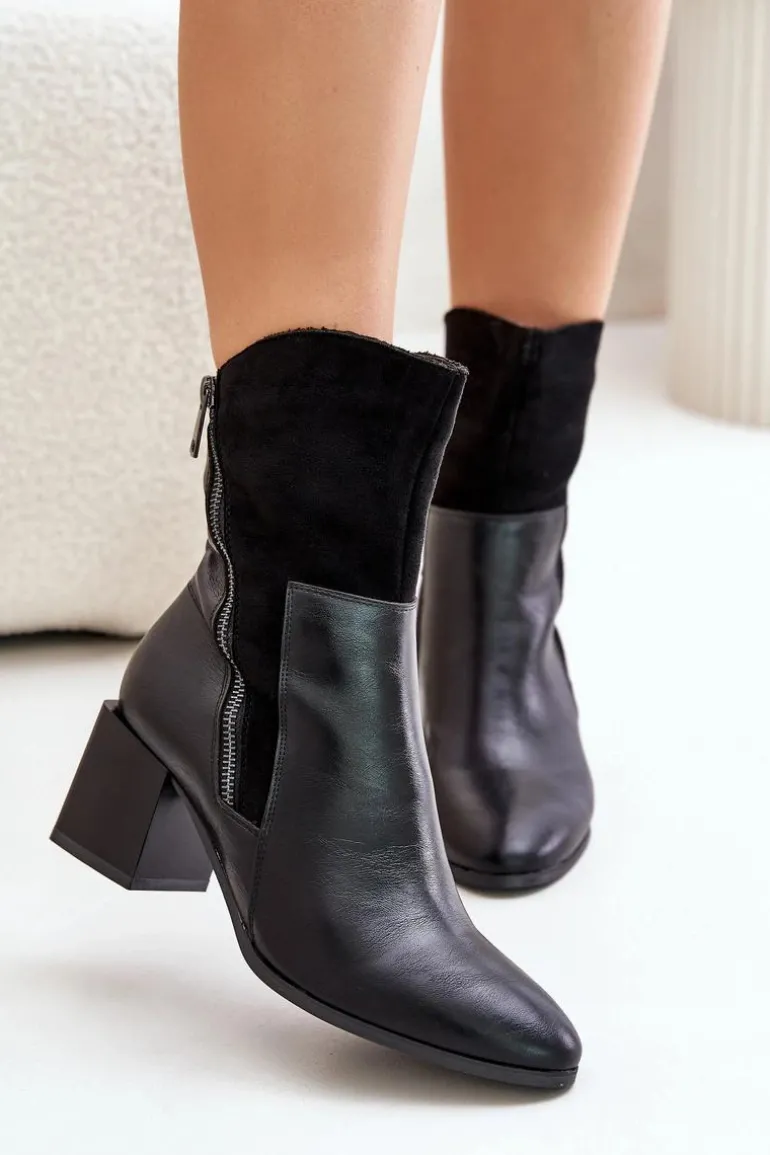 Damskie botki wykonane z eko skóry, osadzone na stabilnym obcasie typu słupek. Zapinane na zamek, z dodatkowym ozdobnym suwakiem, który dodaje charakteru. Wnętrze ocieplone kocem obuwniczym, zapewniającym ciepło i wygodę w chłodniejsze dni. Idealny wybór dla kobiet ceniących styl i komfort. Przy wyborze rozmiaru prosimy sugerować się tabelą rozmiarów.
