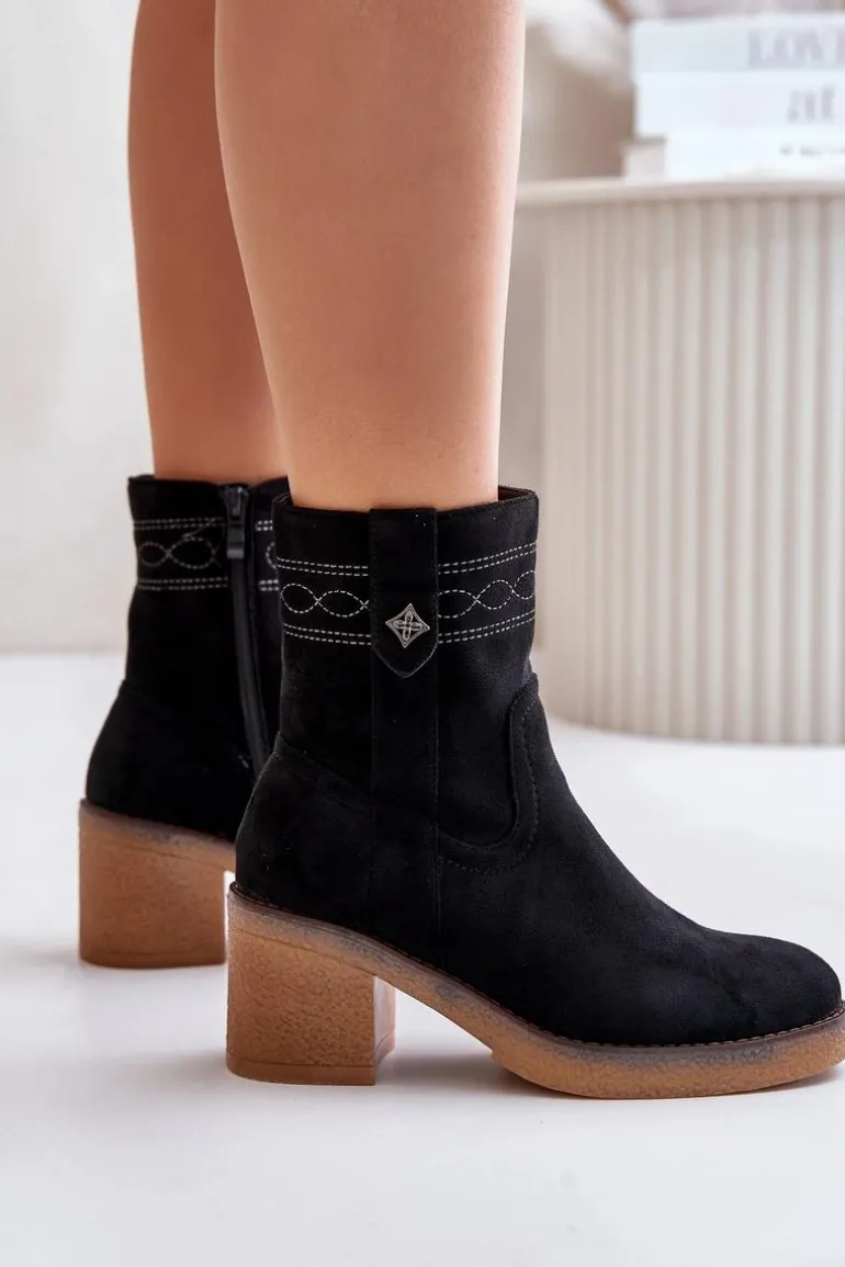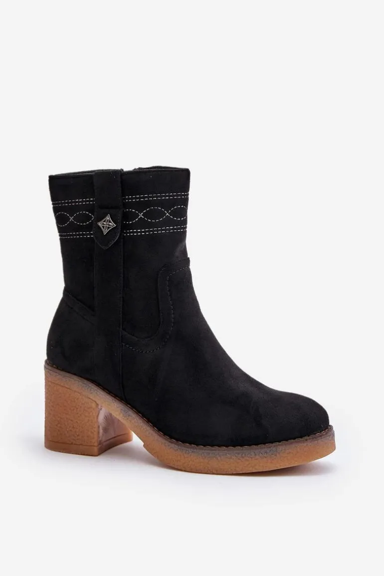 Klasyczne botki damskie wykonane z eko zamszu. Osadzone na obcasie w formie słupka. Noski zaokrąglone. Model ten wyróżnia się przeszyciami na cholewce oraz małym detalem. Wnętrze ocieplane miękkim kocem obuwniczym, idealne na chłodniejsze dni. Przy wyborze rozmiaru prosimy sugerować się tabelą rozmiarów.