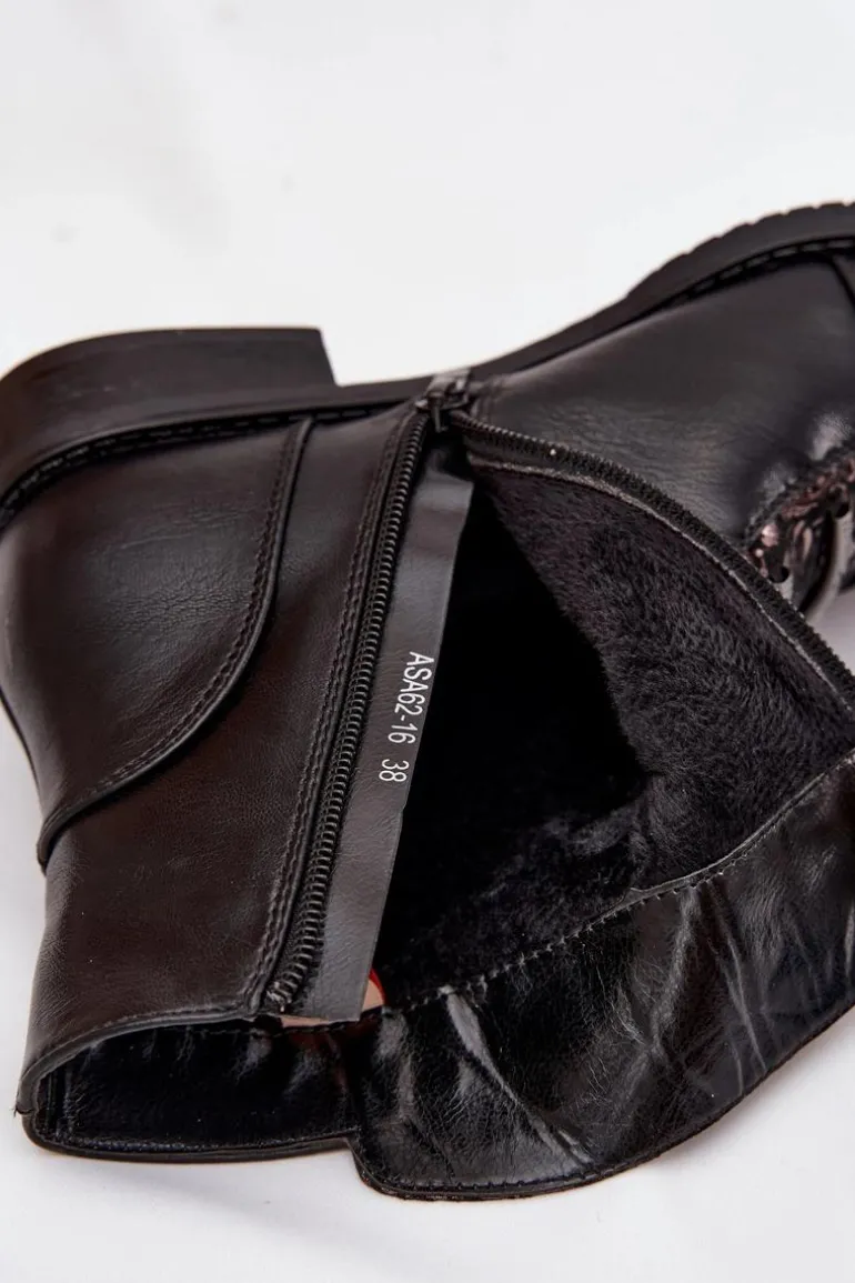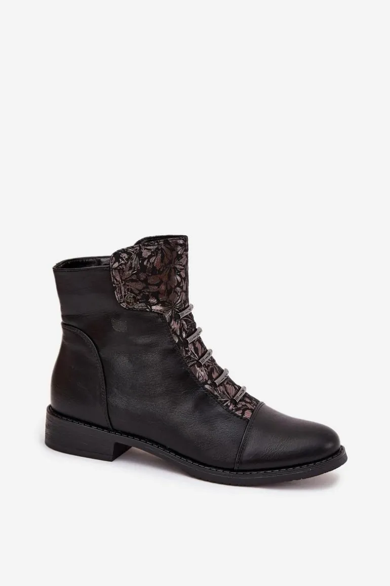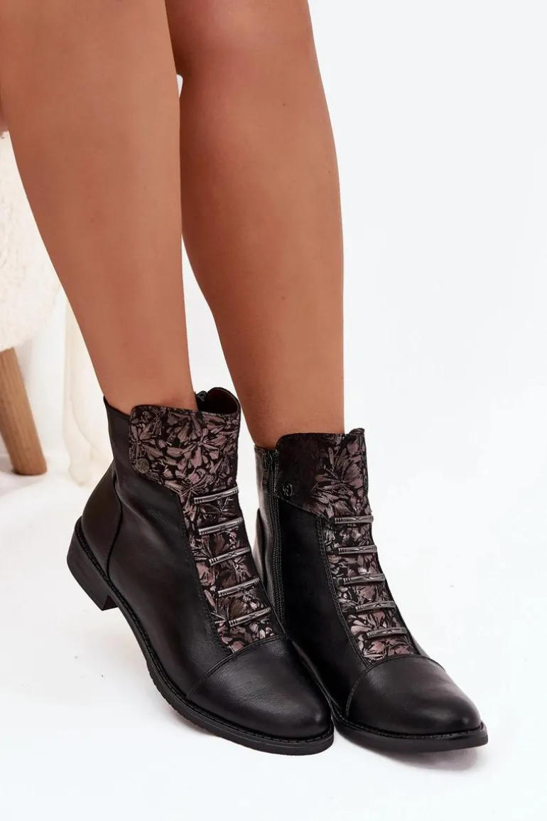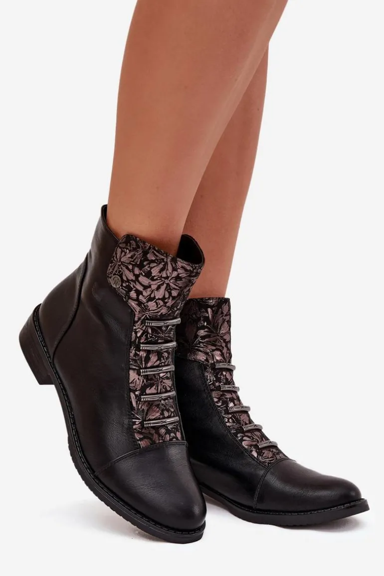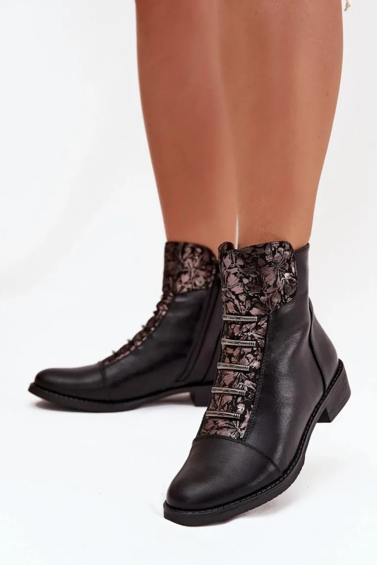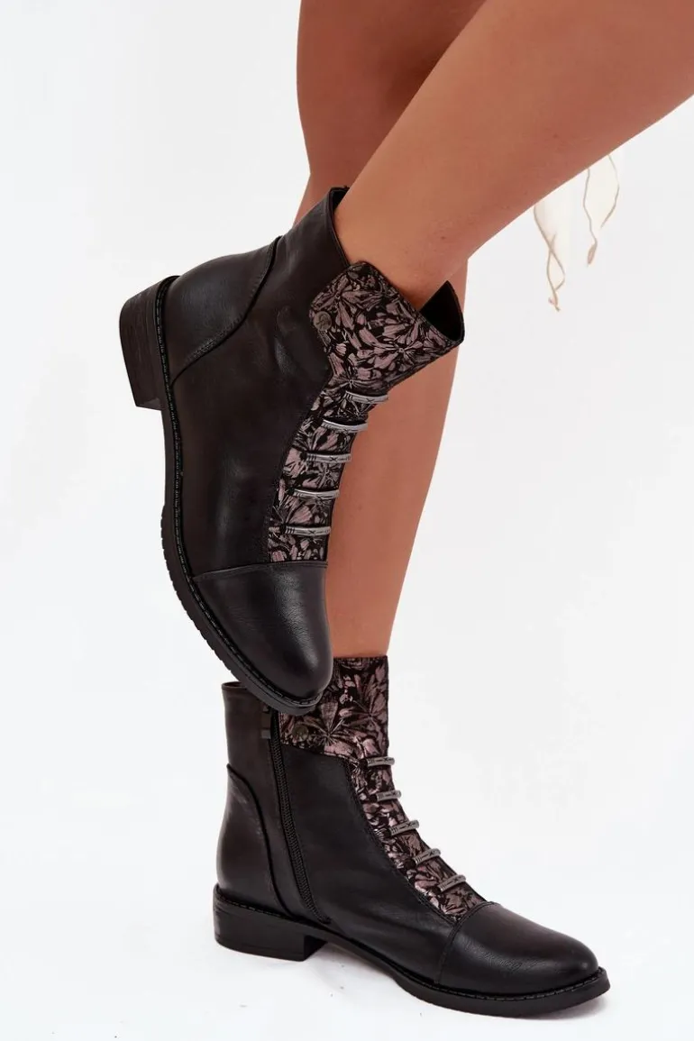 Ocieplane Botki Damskie Na Płaskim Obcasie Kwiaty Czarne Labise
