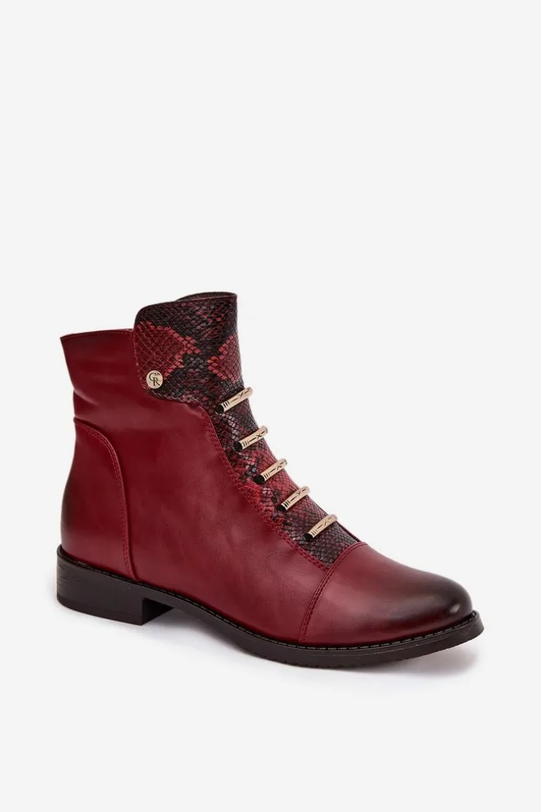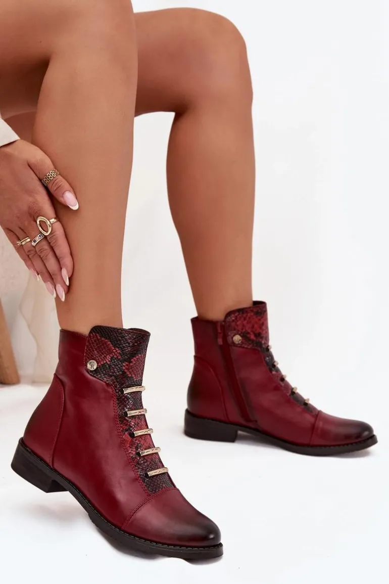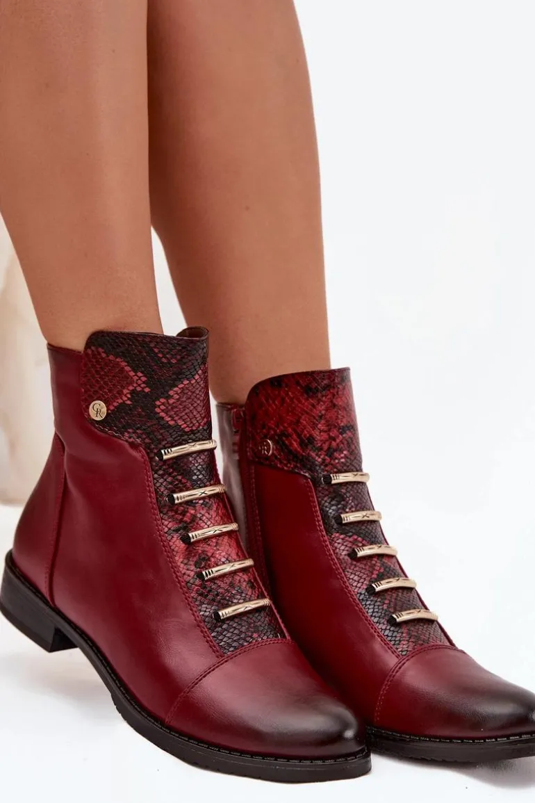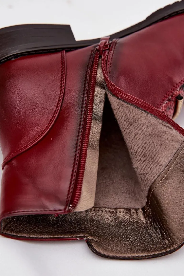 Ocieplane Botki Damskie Na Płaskim Obcasie Zwierzęcy Wzór Bordowe Labise