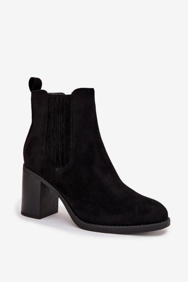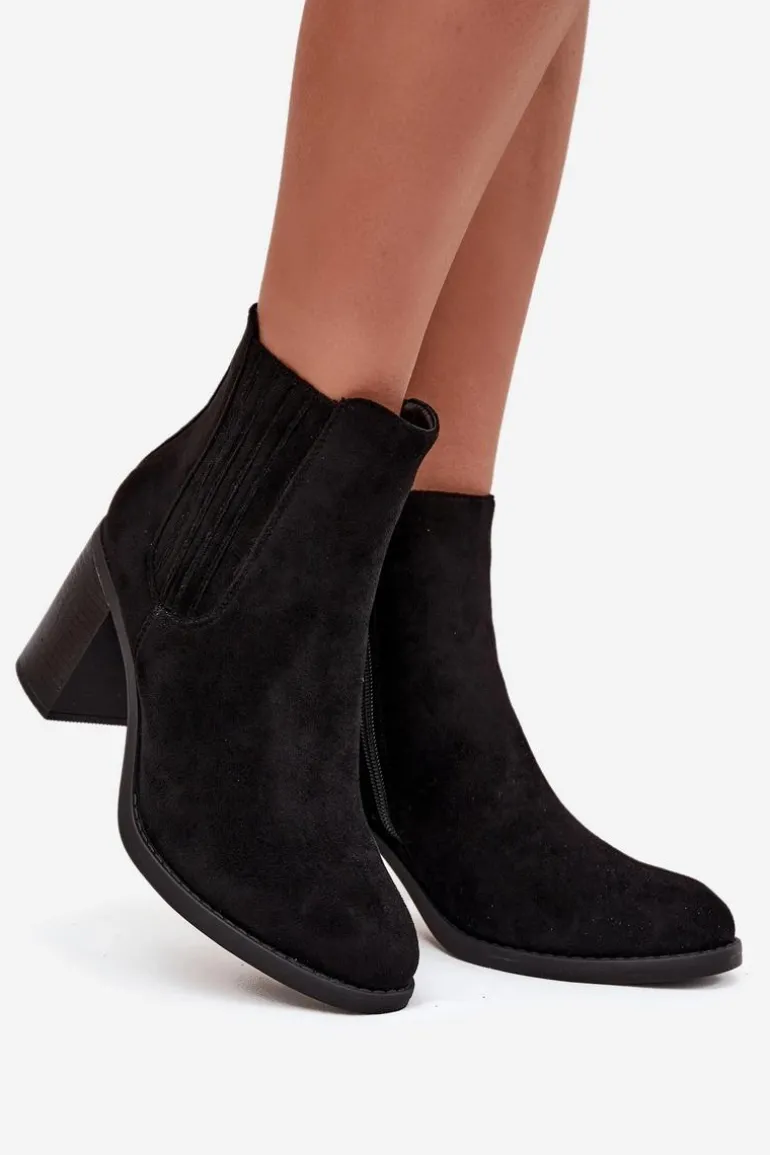 Botki damskie z eko zamszu to ponadczasowa propozycja na chłodniejsze dni. Osadzone na stabilnym obcasie typu słupek zapewniają wygodę i subtelnie podkreślają sylwetkę. Wnętrze zostało ocieplone kocem obuwniczym. Dzięki swojemu klasycznemu fasonowi buty doskonale pasują zarówno do codziennych, jak i eleganckich stylizacji – idealne do spodni, spódnic czy sukienek.