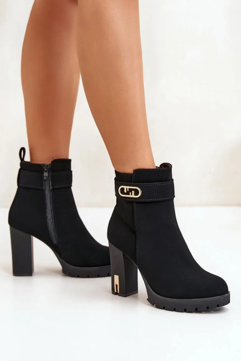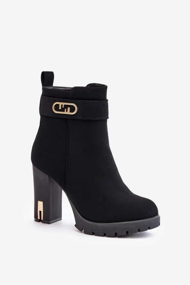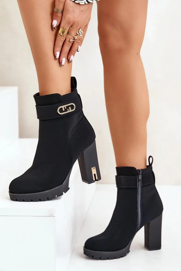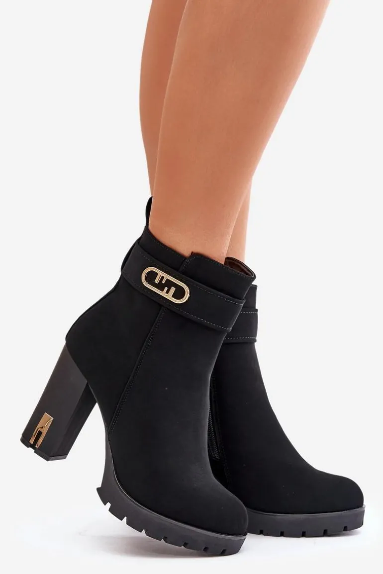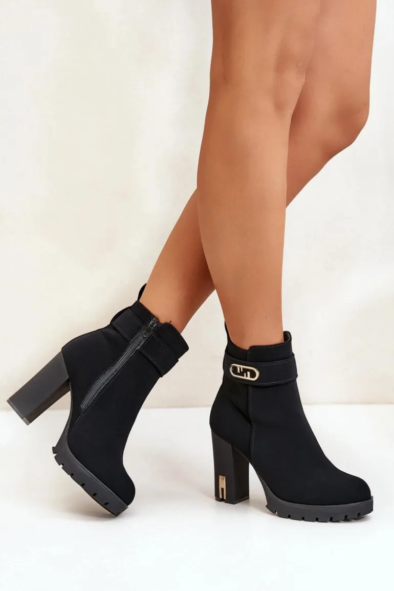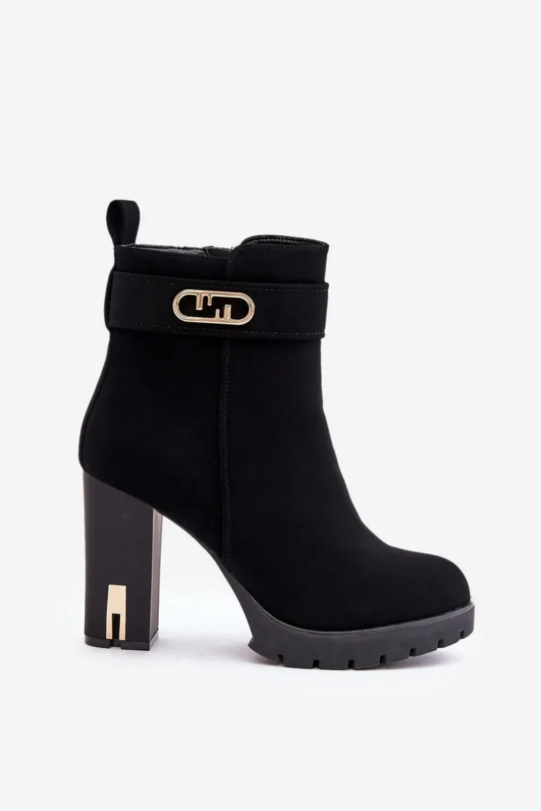 Eleganckie botki z eko skóry to idealny wybór na chłodniejsze dni. Obcas w formie słupka. Środek ocieplony kocem obuwniczym gwarantuje ciepło w chłodniejsze dni. Cholewka ozdobiona paskiem z subtelnym, złotym detalem. Zaokrąglony nosek oraz usztywniany zapiętek dbają o komfort stóp. Model ten świetnie sprawdzi się w wielu jesienno-zimowych stylizacjach! Przy wyborze rozmiaru prosimy sugerować się tabelą rozmiarów.