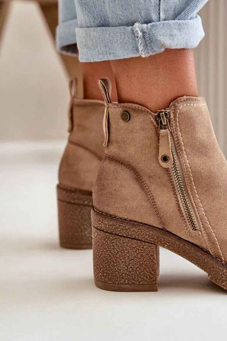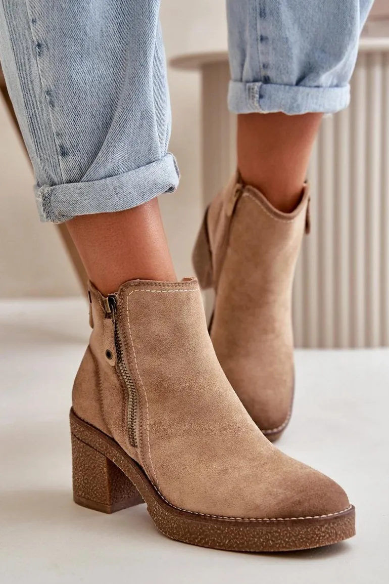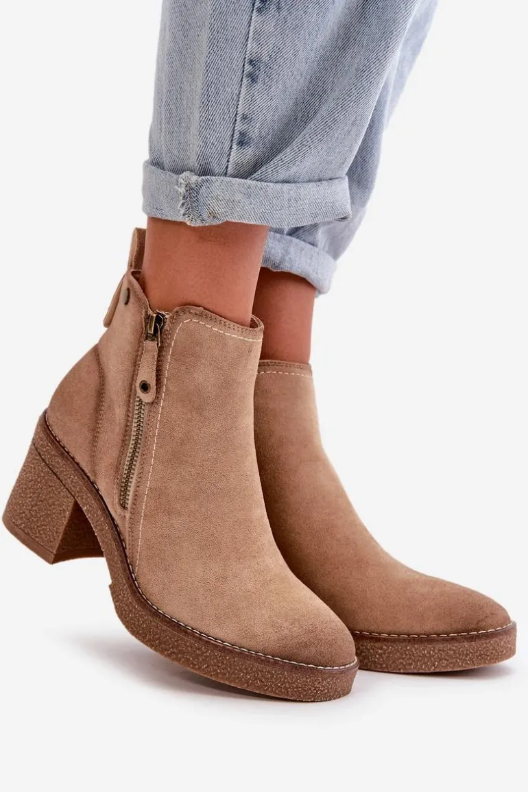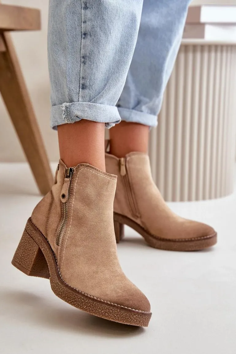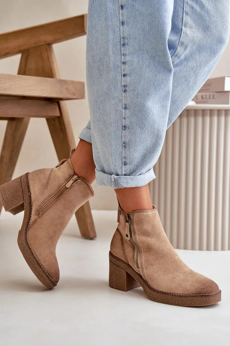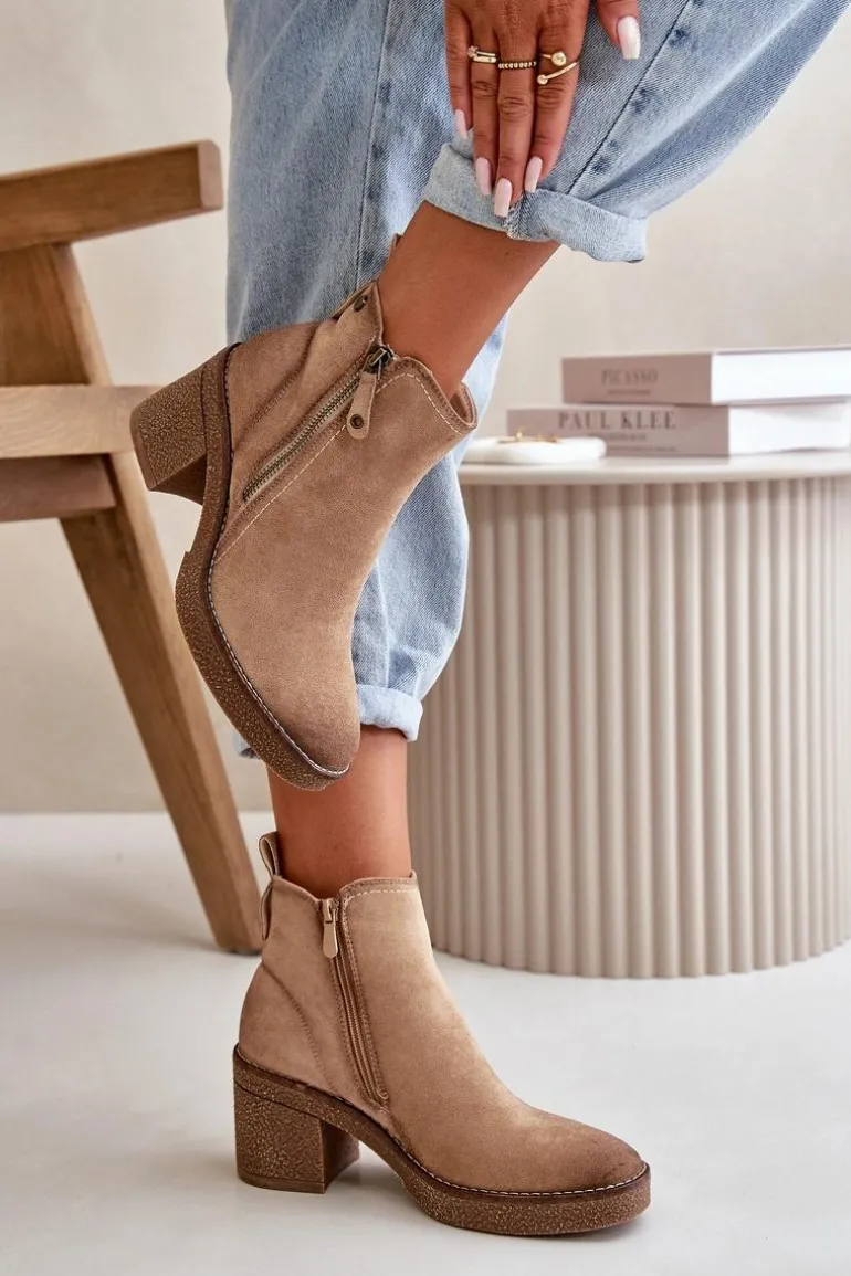 Damskie botki wykonane z miękkiego eko zamszu. Osadzone na stabilnym obcasie słupku. Wnętrze ocieplone kocem obuwniczym, co zapewnia ciepło i komfort noszenia. Model ten posiada zaokrąglone noski i jest zapinany na zamek, co ułatwia zakładanie i zdejmowanie. Idealne do jesiennych i zimowych stylizacji. Przy wyborze rozmiaru prosimy sugerować się tabelą rozmiarów.