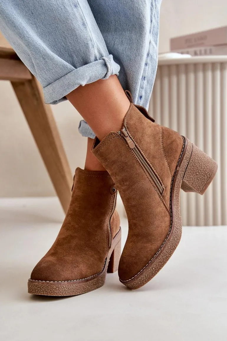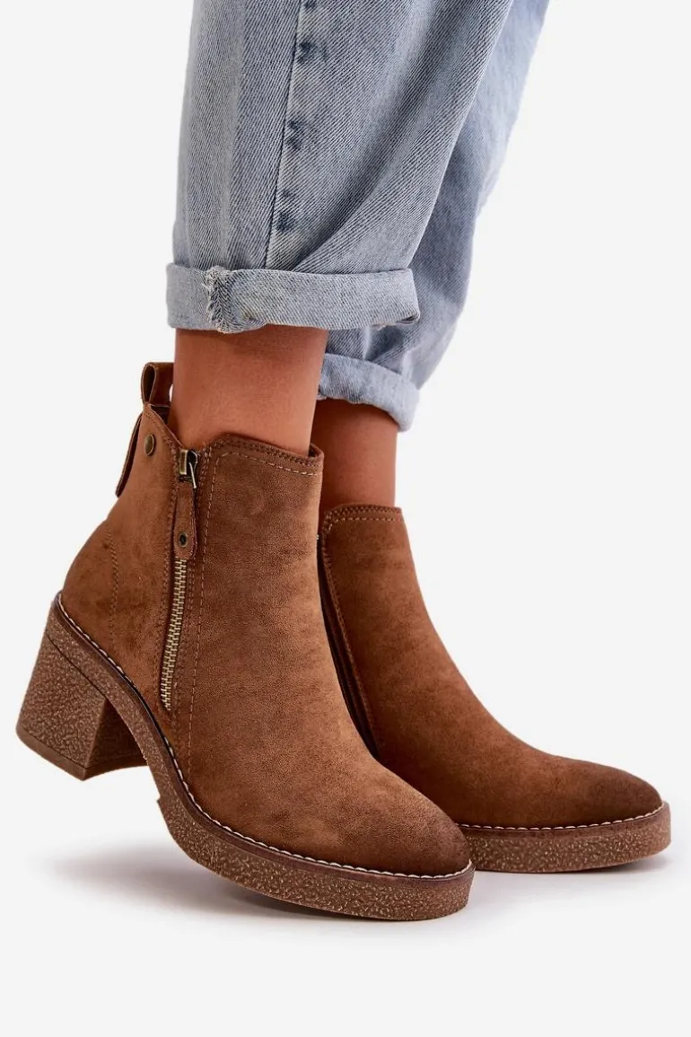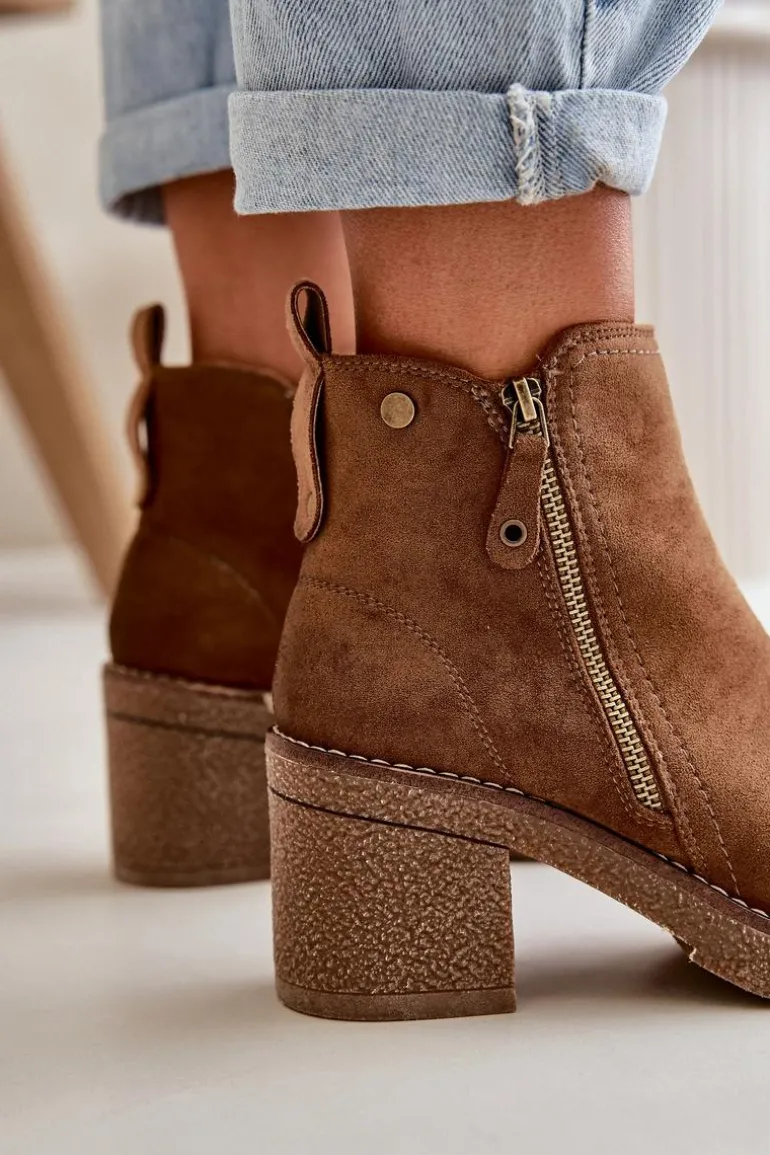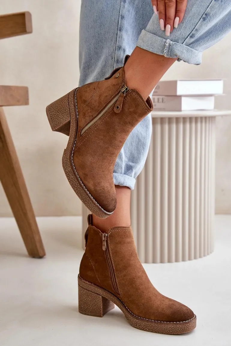 Ocieplane Botki Damskie Na Słupku Z Eko Zamszu Brązowe Velarilla