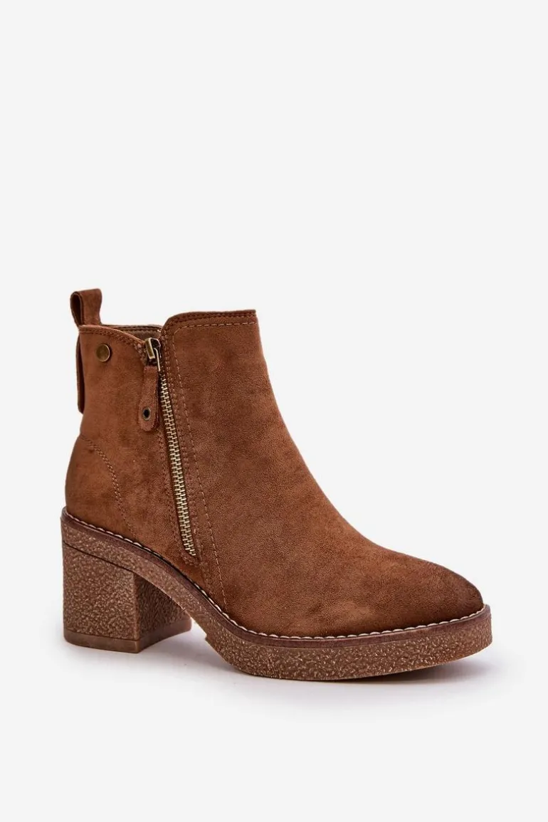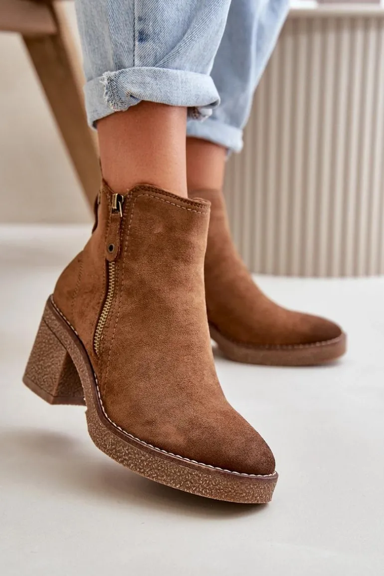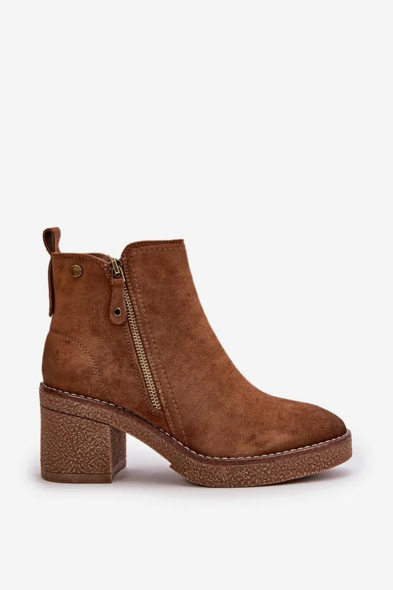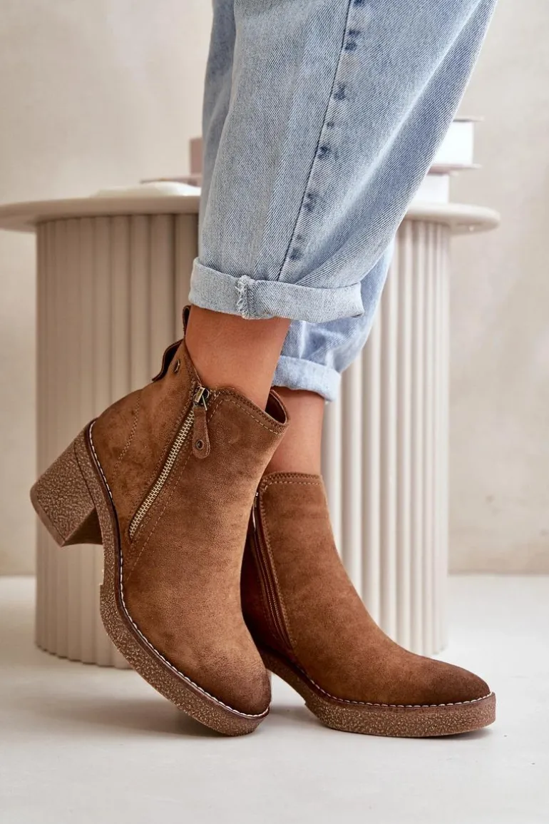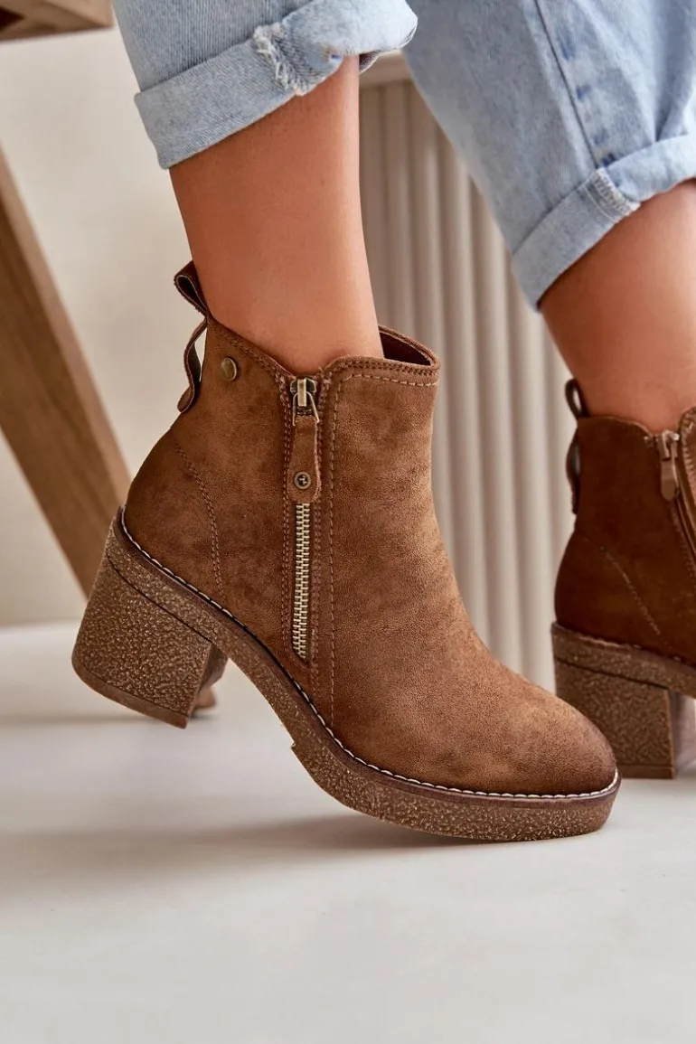 Ocieplane Botki Damskie Na Słupku Z Eko Zamszu Brązowe Velarilla