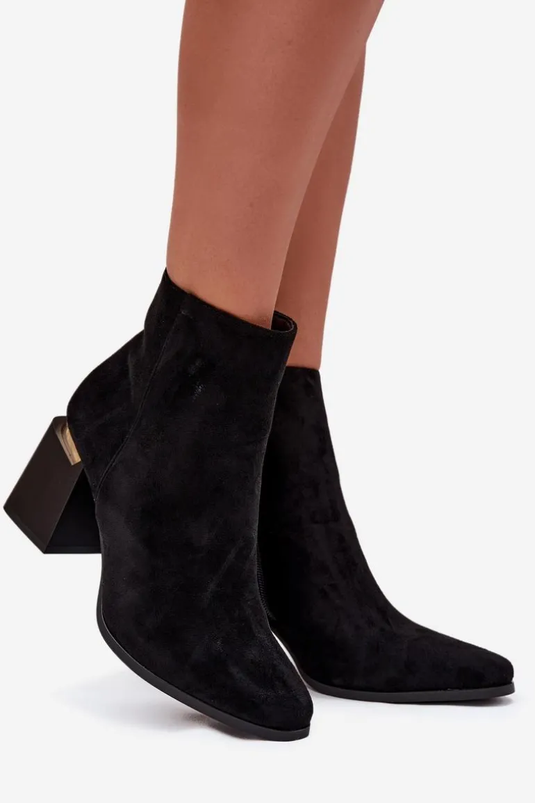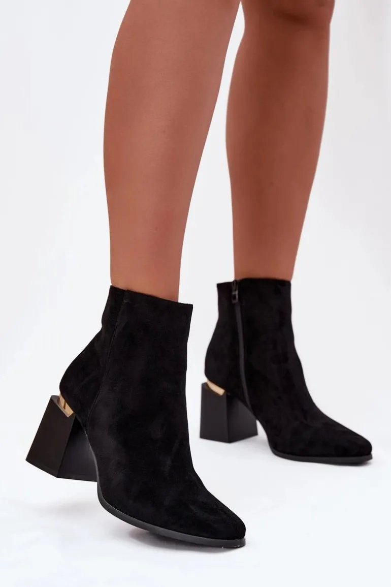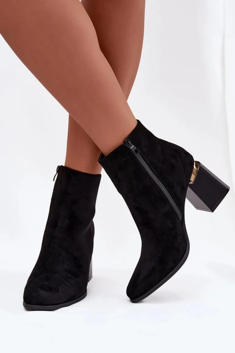 Botki damskie ocieplane z obcasem typu słupek i złotym akcentem to elegancka i praktyczna propozycja na chłodniejsze dni. Noski w kształcie migdała podkreślają kobiecy charakter, a zamek po boku ułatwia szybkie zakładanie i idealne dopasowanie do stopy. Stylowy złoty detal przy obcasie dodaje nowoczesnego akcentu, dzięki czemu botki doskonale sprawdzą się zarówno w codziennych, jak i bardziej eleganckich stylizacjach. Przy wyborze rozmiaru prosimy sugerować się tabelą rozmiarów.