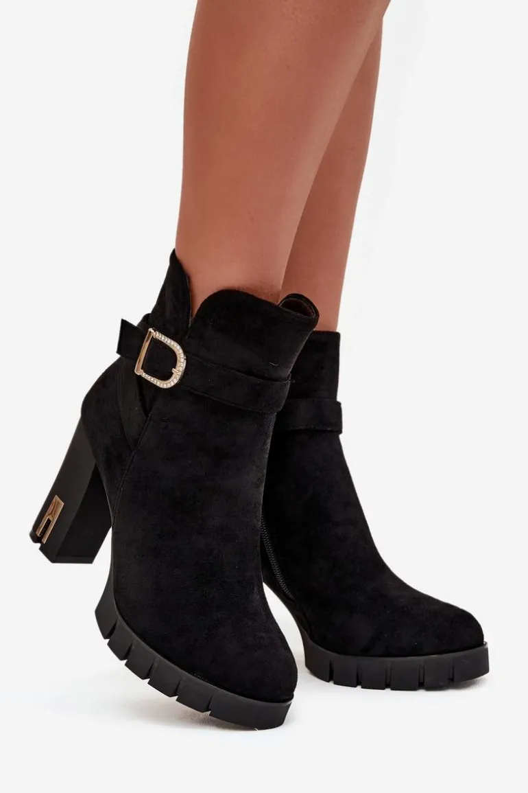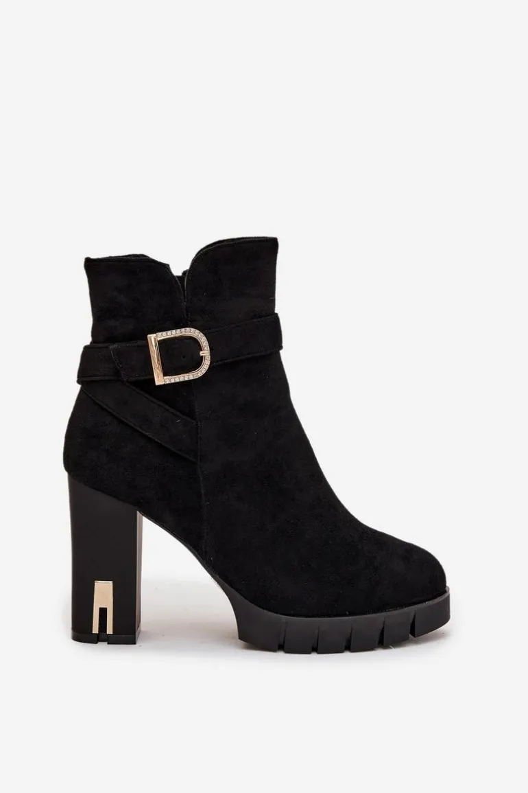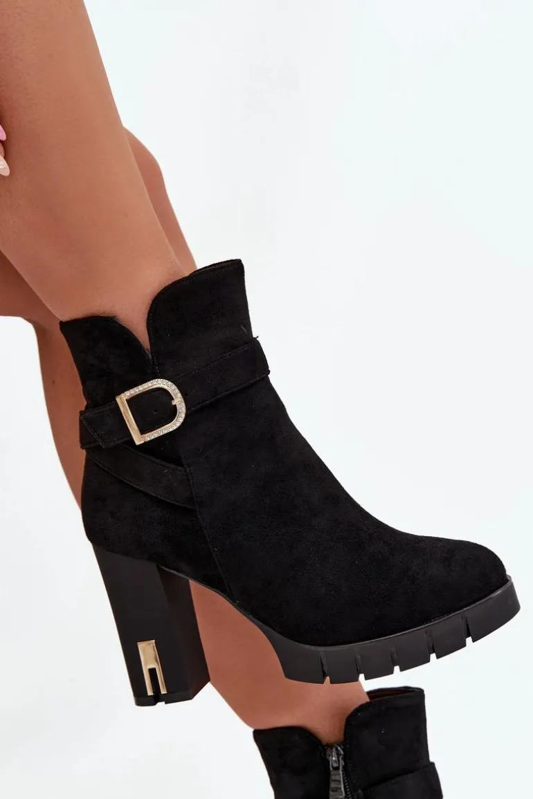 Botki damskie wykonane z eko zamszu. Wnętrze zostało ocieplone kocem obuwniczym, co zapewnia komfort termiczny i miękkość podczas noszenia. Buty są zapinane na zamek, dzięki czemu łatwo je zakładać i zdejmować. Dodatkowym atutem jest dekoracyjny pasek z klamrą, który nadaje im modnego charakteru i sprawia, że świetnie prezentują się w codziennych stylizacjach. To uniwersalny model, pasujący zarówno do spodni, jak i sukienek. Przy wyborze rozmiaru prosimy sugerować się tabelą rozmiarów.