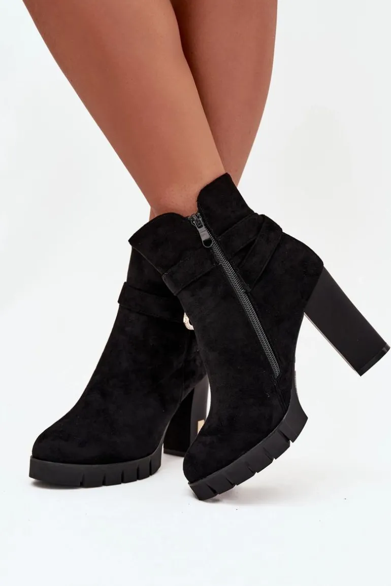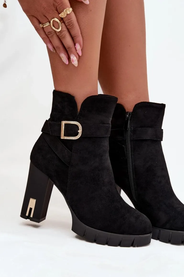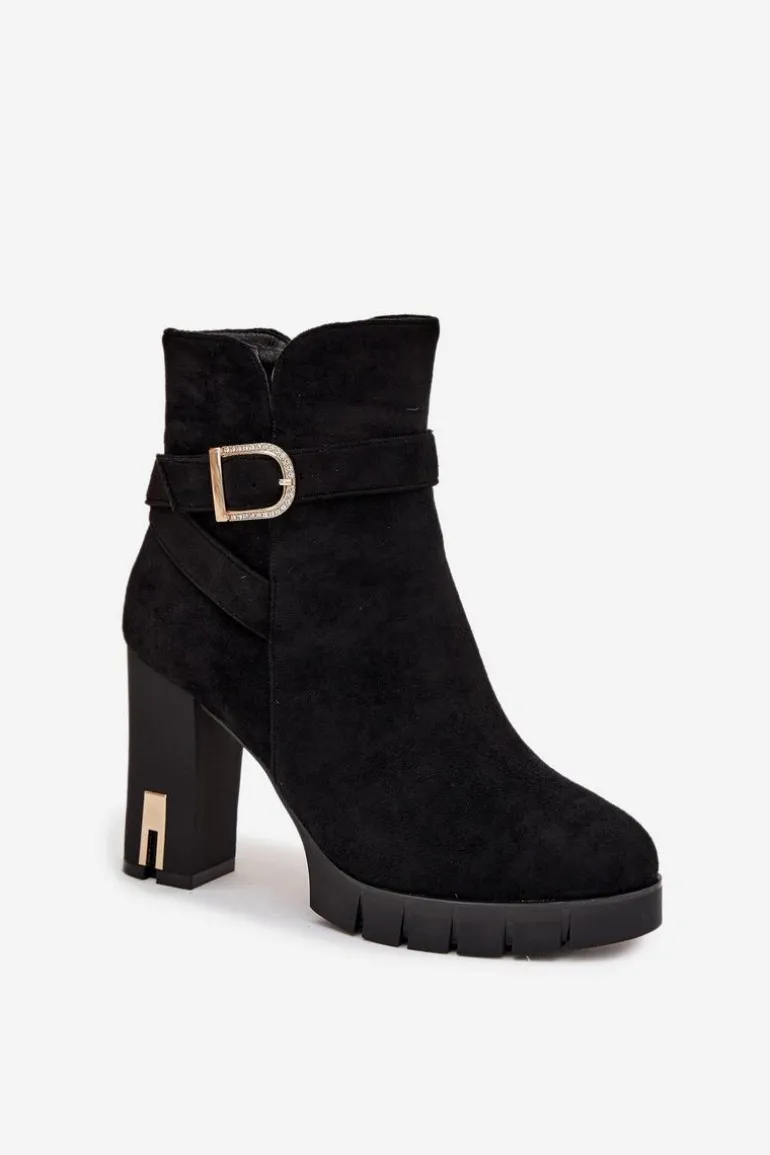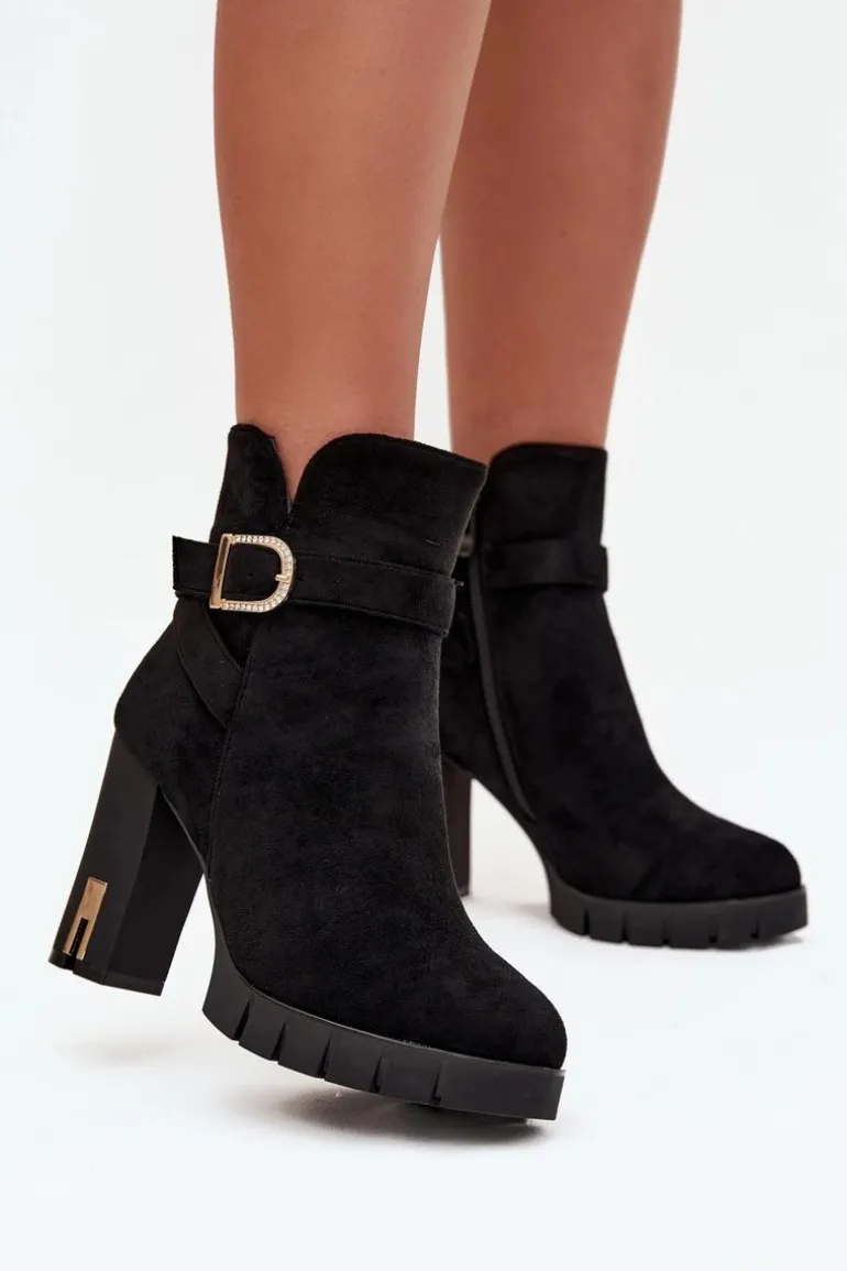 Botki damskie wykonane z eko zamszu. Wnętrze zostało ocieplone kocem obuwniczym, co zapewnia komfort termiczny i miękkość podczas noszenia. Buty są zapinane na zamek, dzięki czemu łatwo je zakładać i zdejmować. Dodatkowym atutem jest dekoracyjny pasek z klamrą, który nadaje im modnego charakteru i sprawia, że świetnie prezentują się w codziennych stylizacjach. To uniwersalny model, pasujący zarówno do spodni, jak i sukienek. Przy wyborze rozmiaru prosimy sugerować się tabelą rozmiarów.