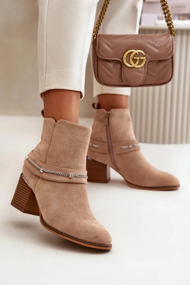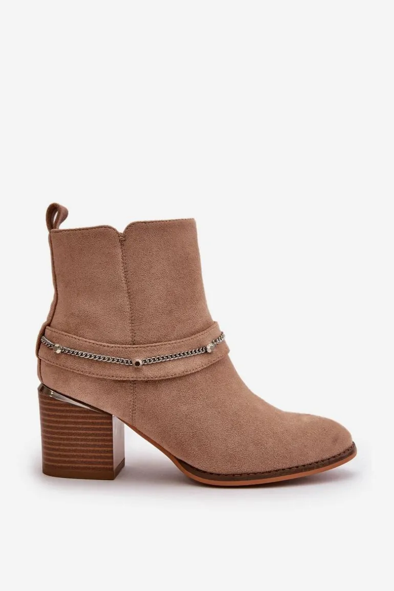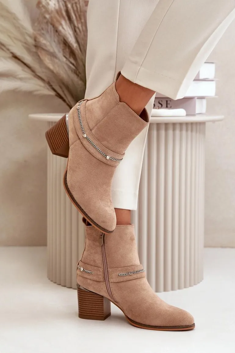 Botki z eko zamszu na obcasie w formie słupka to stylowy wybór na chłodniejsze dni. Cholewka ozdobiona łańcuszkiem dodaje charakteru i wyrazistości. Zapięcie na zamek ułatwia zakładanie i zdejmowanie, a ocieplone wnętrze z koca obuwniczego zapewnia ciepło i komfort. Idealne na jesienne i zimowe stylizacje, te botki łączą w sobie modny wygląd i wygodę noszenia.Przy wyborze rozmiaru prosimy sugerować się tabelą rozmiarów.