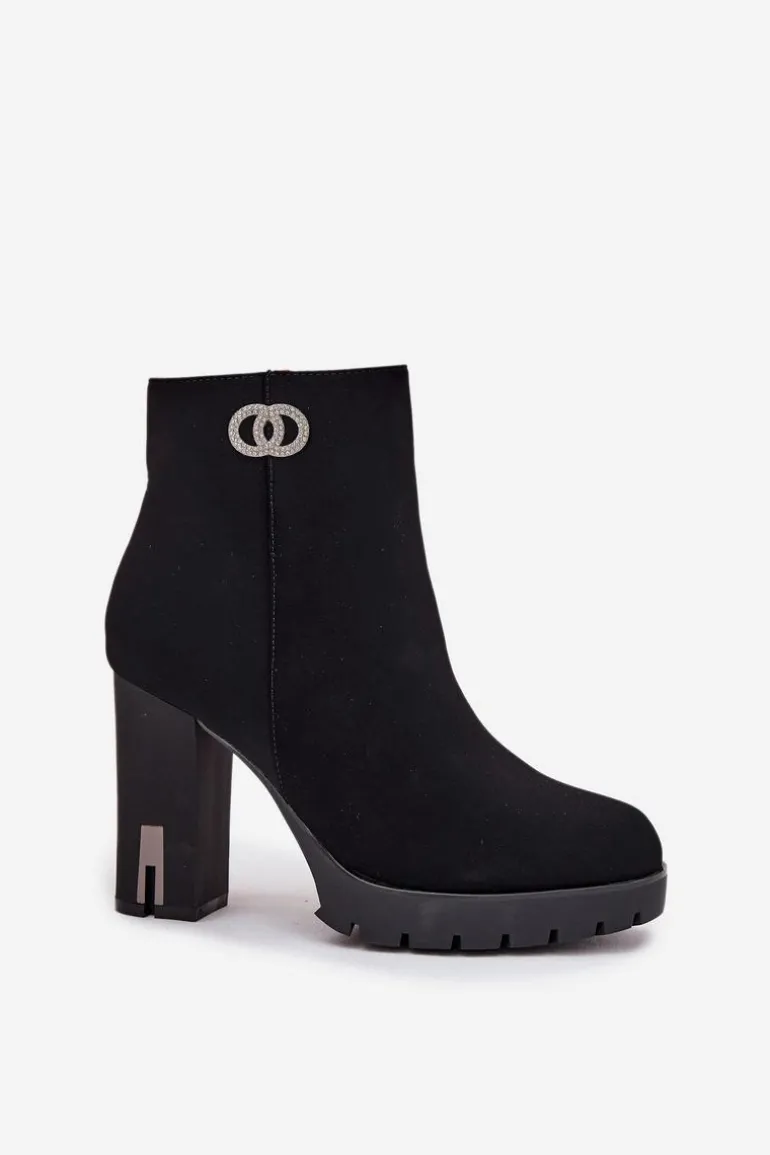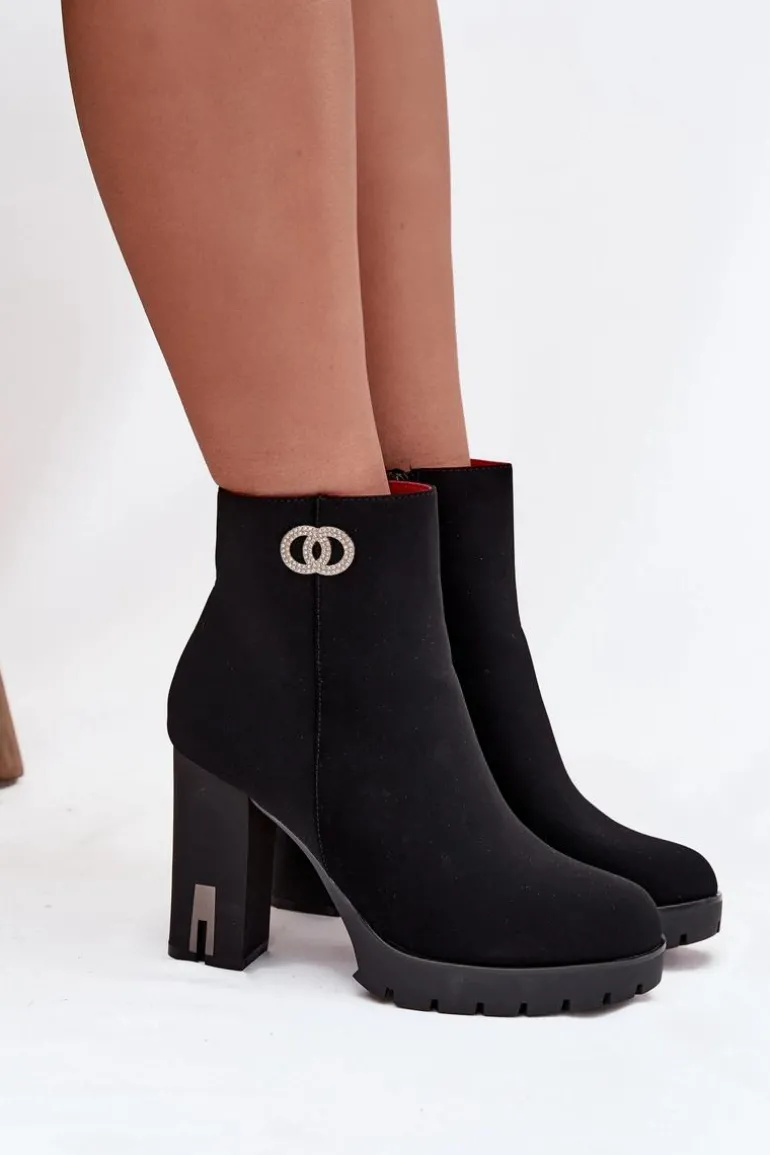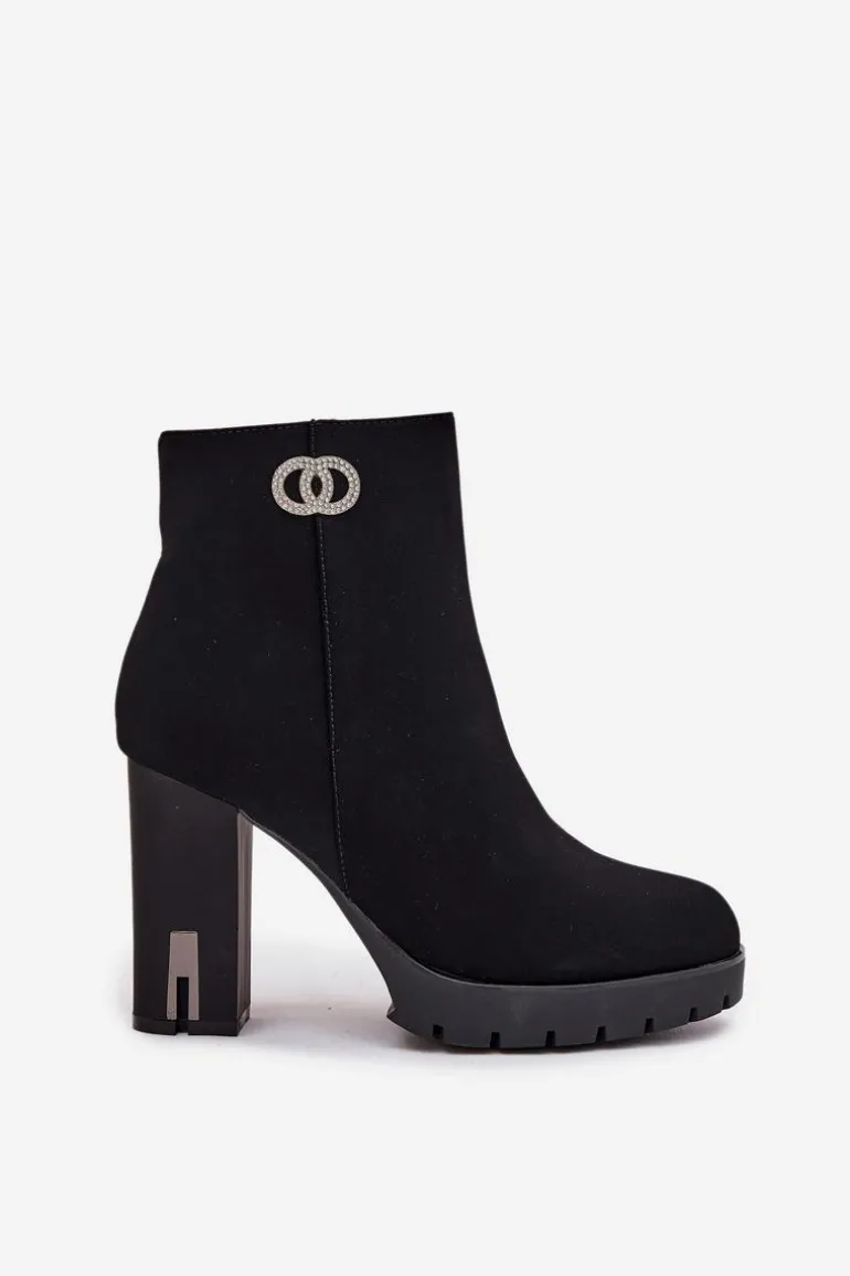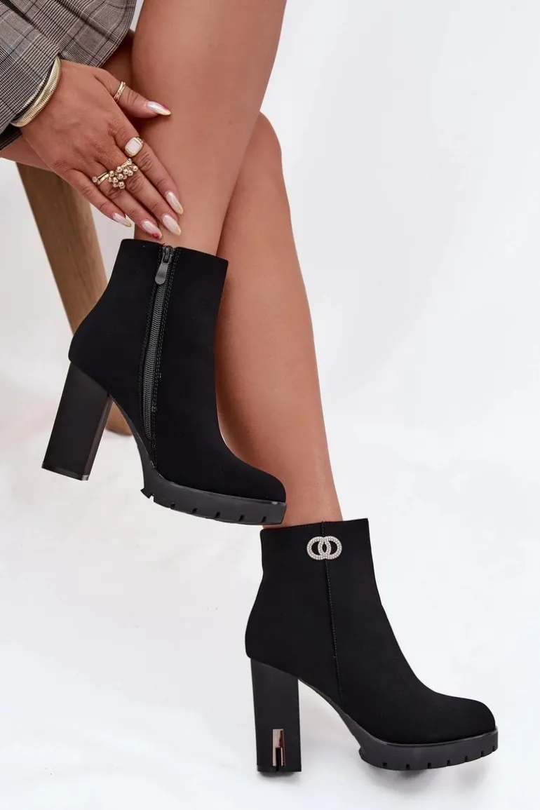 Damskie botki z wysokim obcasem typu słupek to połączenie elegancji i wygody. Charakteryzują się ozdobnym detalem, który nadaje im modnego, wyrazistego charakteru. Zamek błyskawiczny ułatwia zakładanie, a wnętrze ocieplane kocem obuwniczym zapewnia ciepło i komfort w chłodniejsze dni. Te botki to idealny wybór do stylizacji, które wymagają zarówno klasycznego, jak i nowoczesnego akcentu! Przy wyborze rozmiaru prosimy sugerować się tabelą rozmiarów.