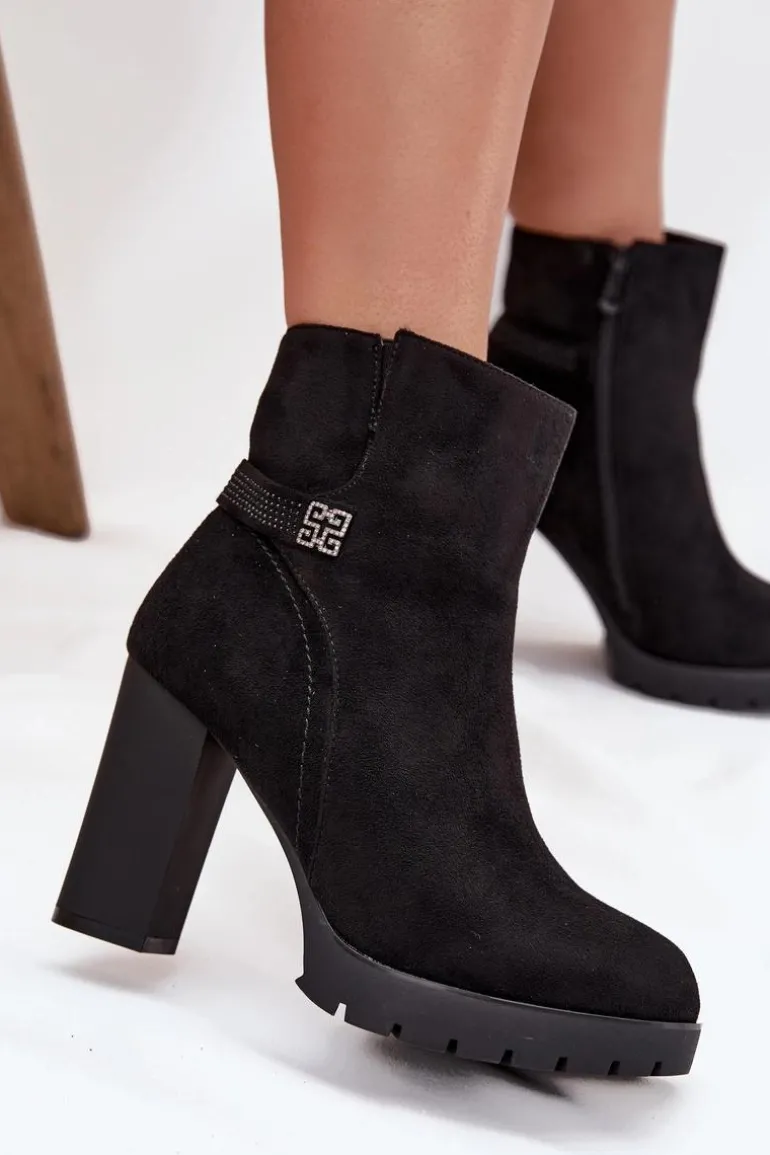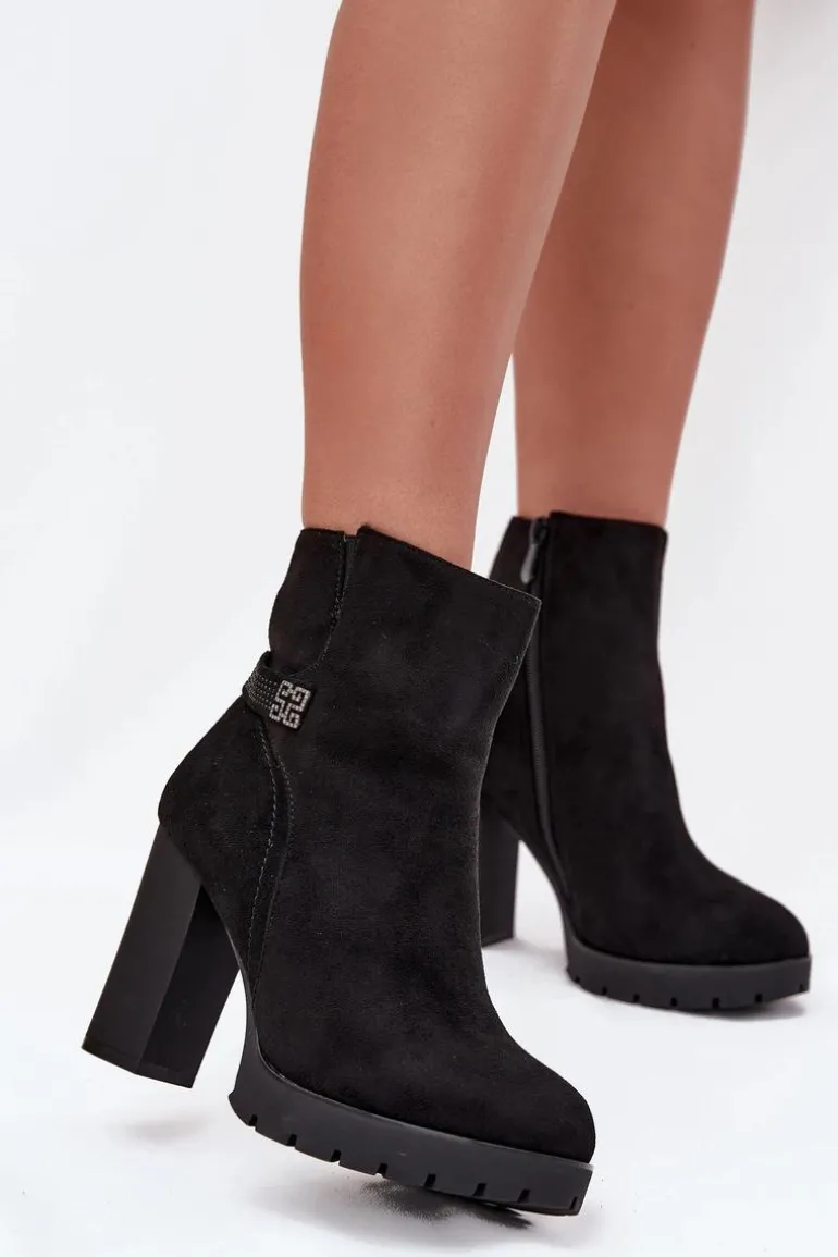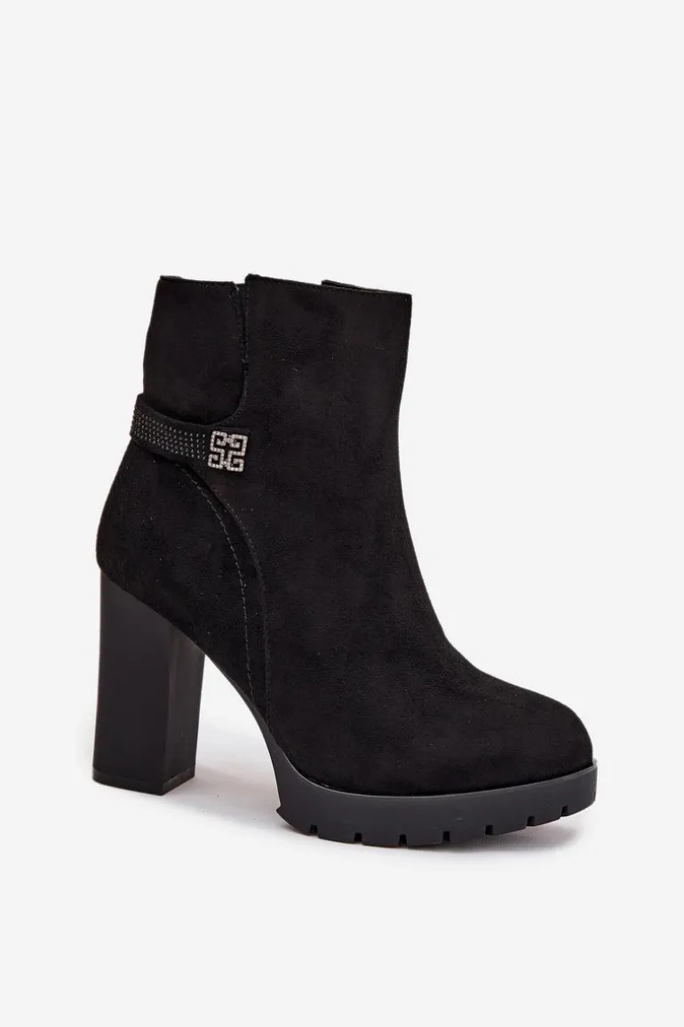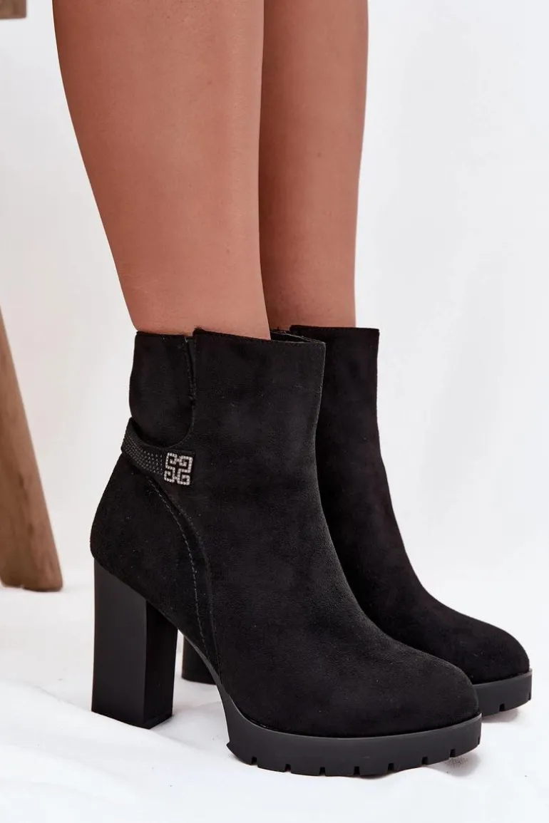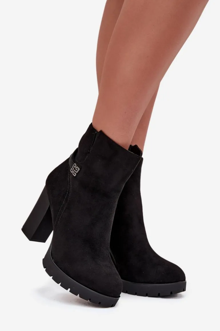 Damskie botki z eko zamszu to elegancka propozycja na chłodniejsze dni. Osadzone na obcasie typu słupek. Wnętrze jest ocieplane, co gwarantuje ciepło w chłodniejsze dni. Zamek błyskawiczny ułatwia zakładanie, a ozdobny paseczek na cholewce dodaje modnego akcentu. Te botki doskonale komponują się z różnorodnymi stylizacjami, łącząc elegancję z funkcjonalnością. Przy wyborze rozmiaru prosimy sugerować się tabelą rozmiarów.