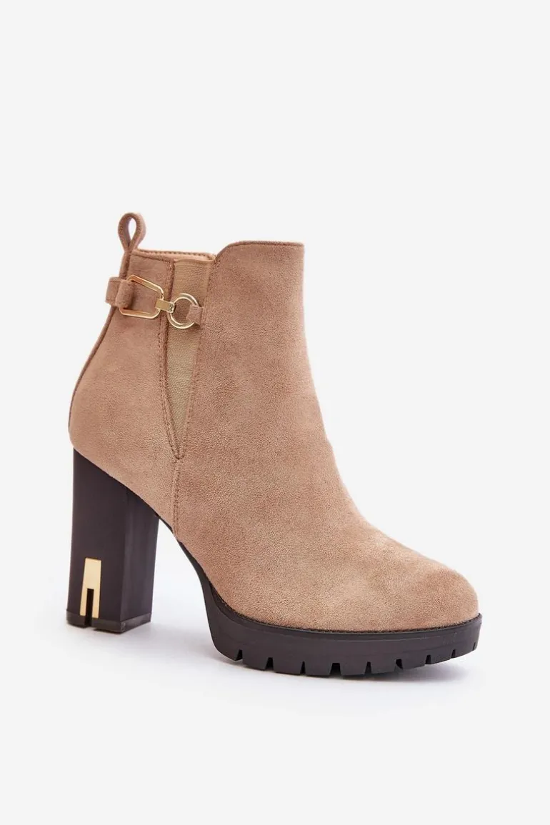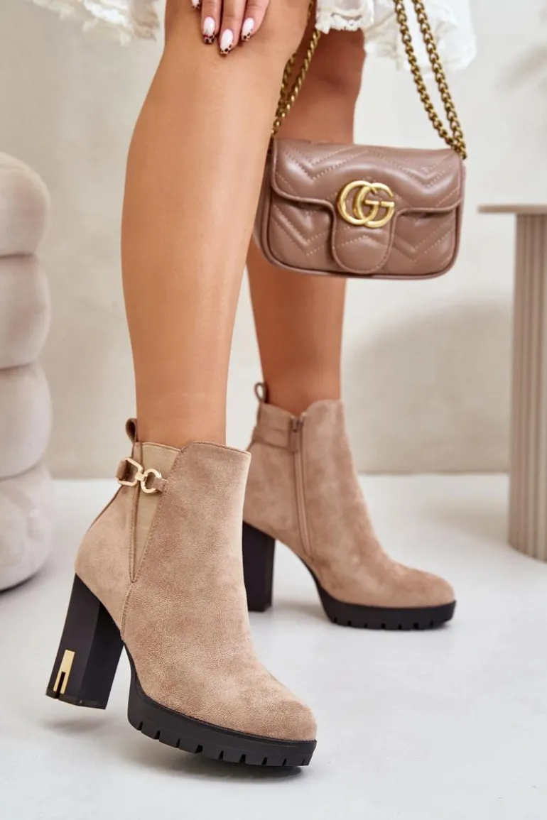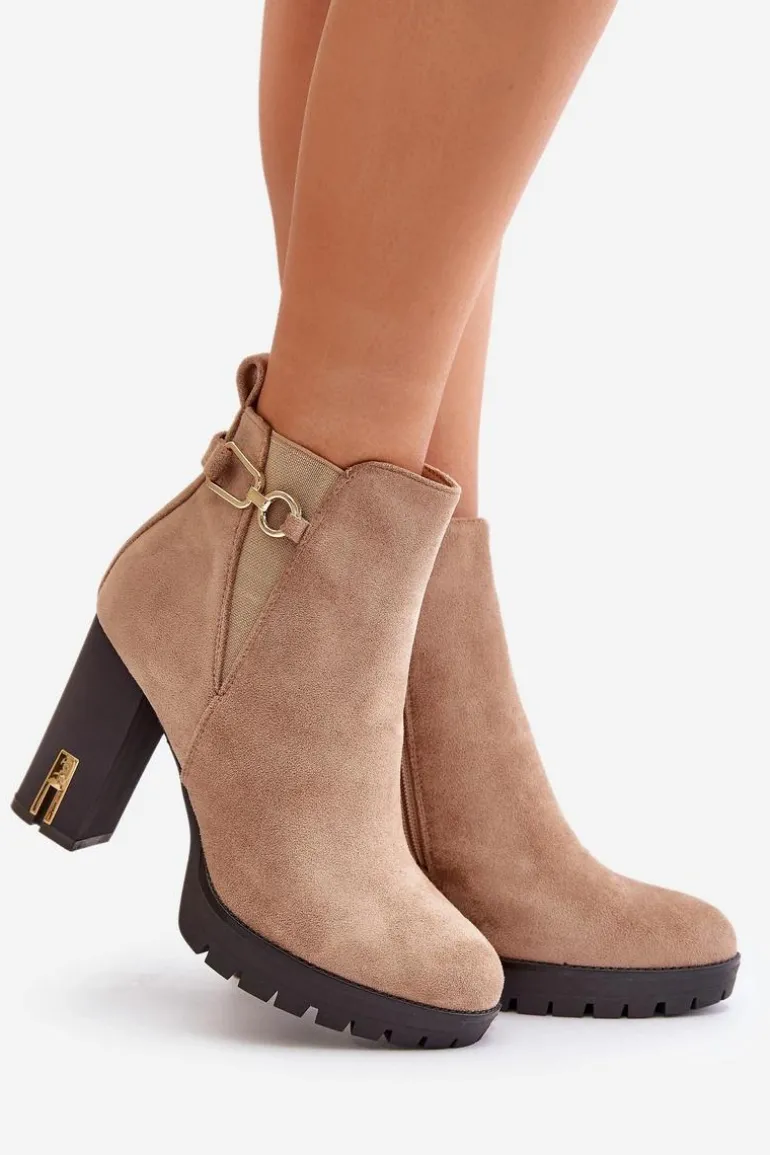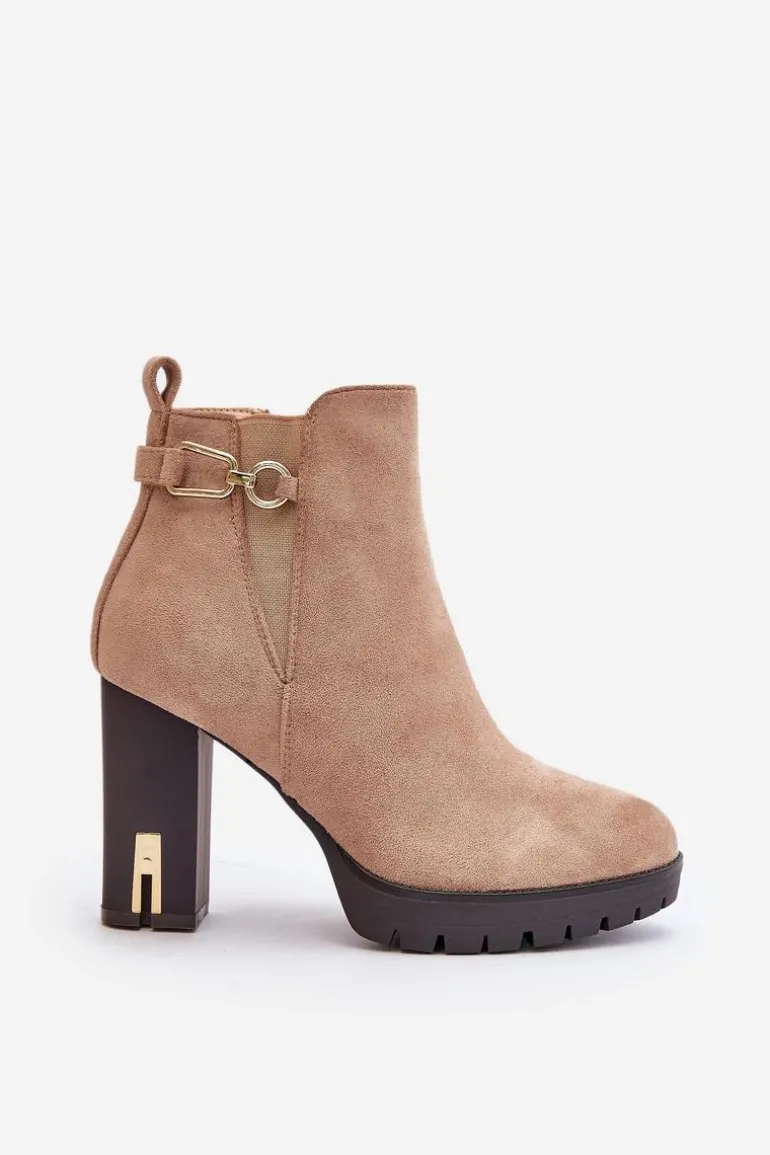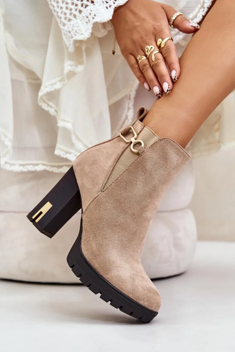 Eleganckie botki damskie zostały wykonane z eko zamszu. Osadzone na wysokim obcasie słupku. Model zapinany na suwak. Wnętrze ocieplone kocem obuwniczym. Idealne do wielu stylizacji np.: do sukienek, spódnic czy spodni. Te botki koniecznie powinny znaleźć się w Twojej jesiennej garderobie! Przy wyborze rozmiaru prosimy sugerować się tabelą rozmiarów.