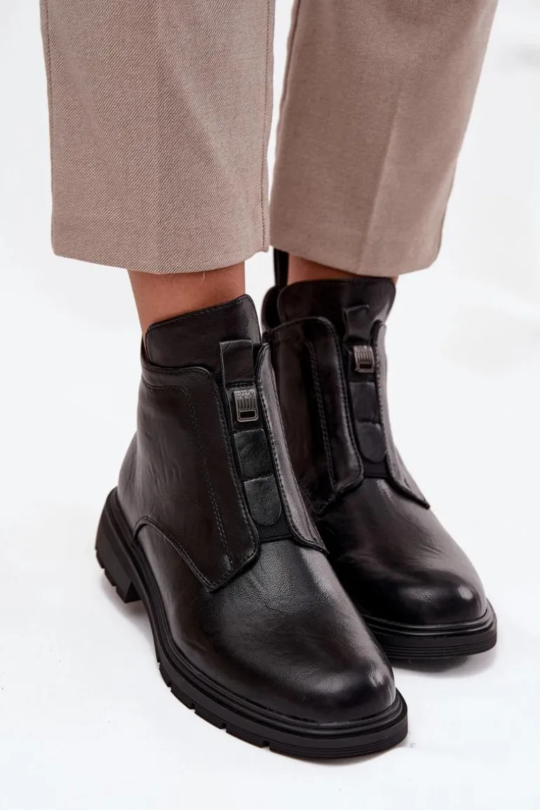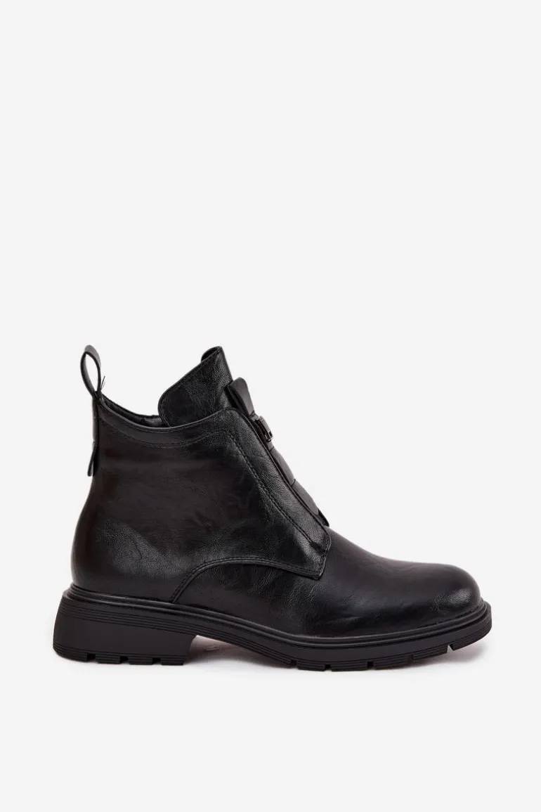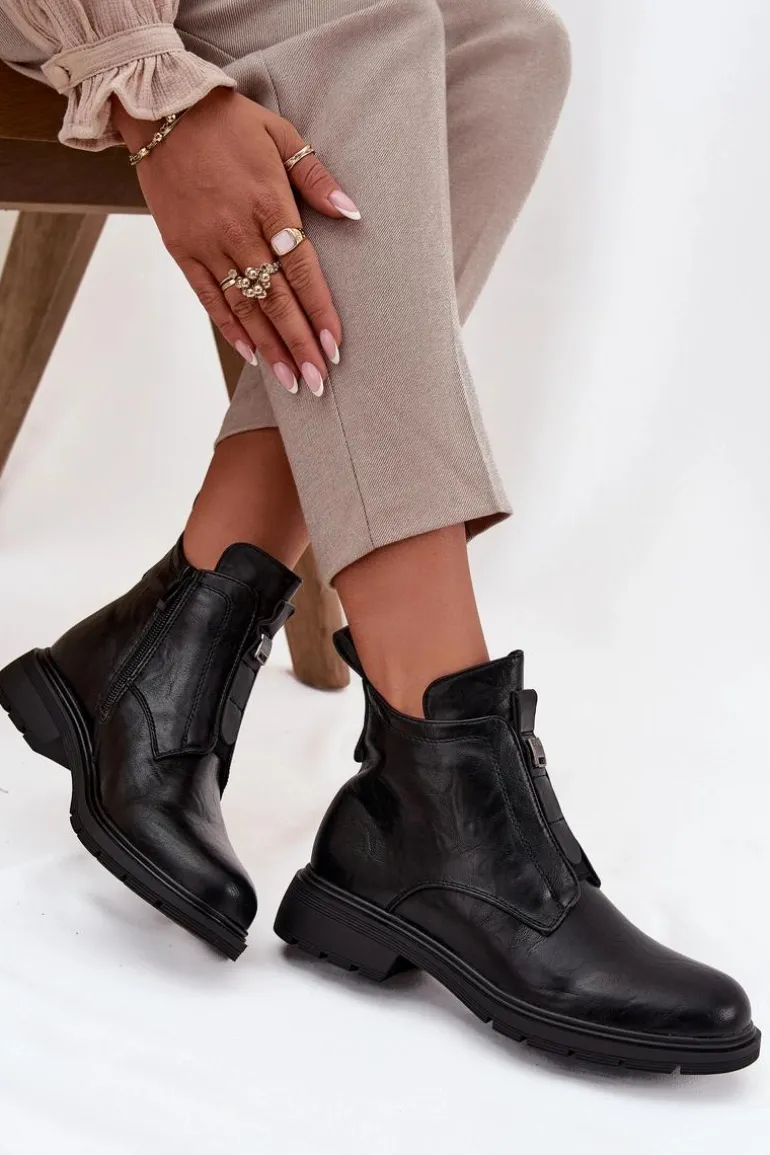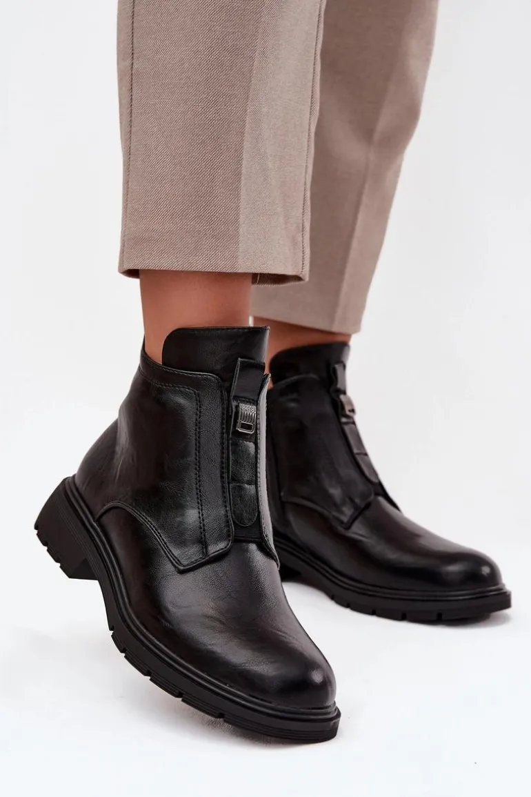 Botki damskie od marki Jezzi to praktyczne połączenie wygody i stylu na chłodniejsze dni. Wykonane z wysokiej jakości eko skóry, prezentują elegancki wygląd przy zachowaniu trwałości i łatwości w utrzymaniu. Osadzone na płaskim obcasie, zapewniają stabilny krok i komfort podczas codziennego noszenia. Model jest zapinany na zamek, co ułatwia szybkie zakładanie i dopasowanie do stopy. Wnętrze ocieplone, gwarantuje ciepło w chłodne dni, a subtelny, ozdobny detal z przodu cholewki dodaje charakteru i modnego akcentu, który wyróżnia je w codziennych stylizacjach. Idealne do casualowych zestawów, jak i do nieco bardziej eleganckich outfitów. Przy wyborze rozmiaru prosimy sugerować się tabelą rozmiarów.