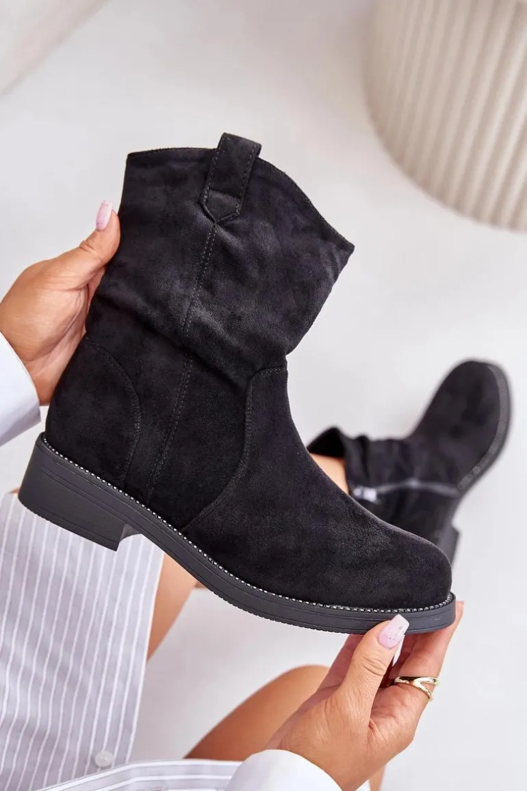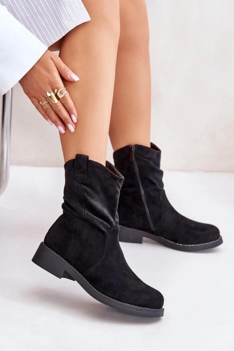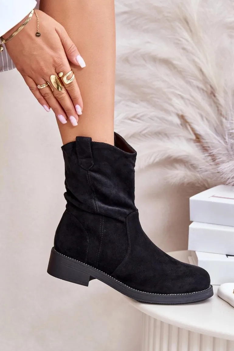 Ocieplane Botki Damskie Z Marszczeniem I Zdobieniem Czarne Etteara