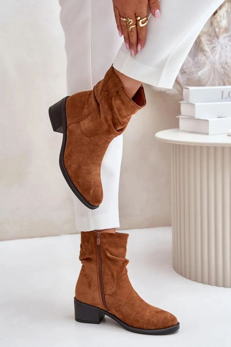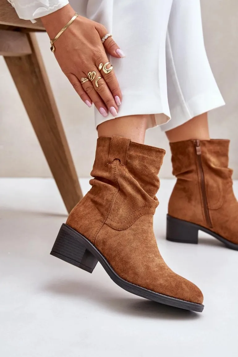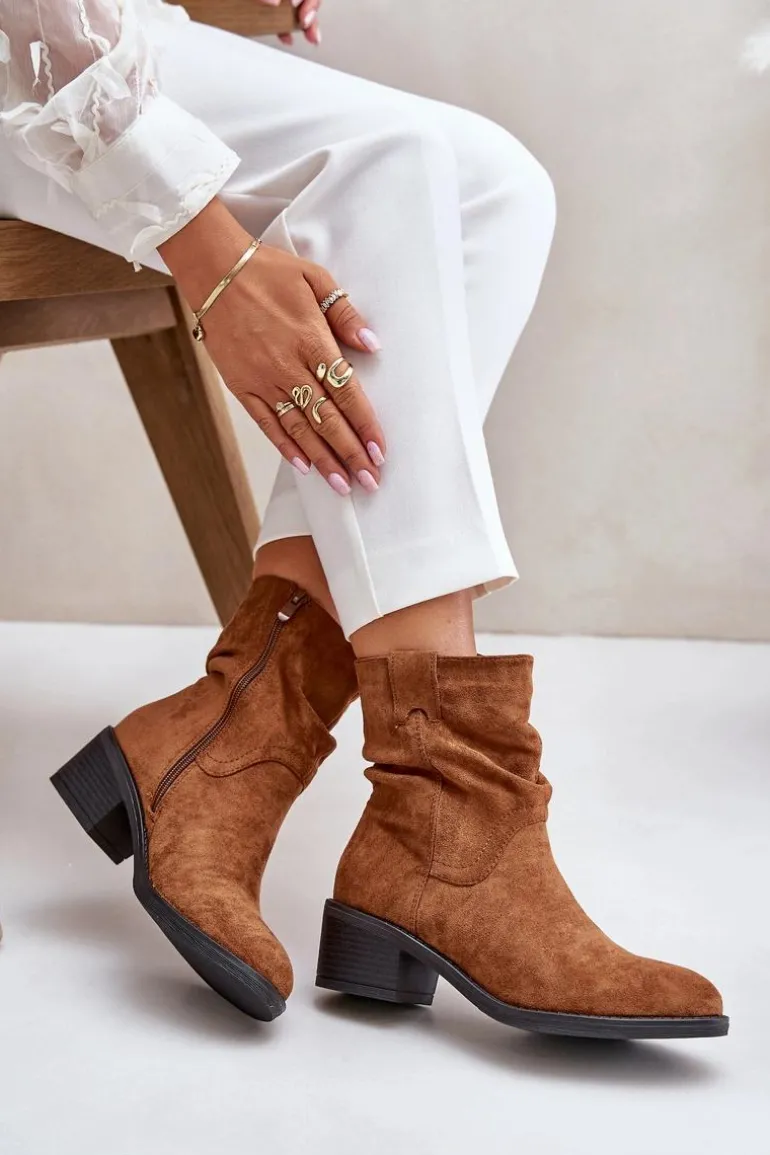 Klasyczne damskie botki wykonane z eko zamszu. Osadzone na niskim, stabilnym obcasie. Noski zaokrąglone. Zapinane na zamek. Model ten wyróżnia się marszczeniami na cholewce. Środek ocieplany kocem obuwniczym, co zapewni ciepło w chłodniejsze dni. Przy wyborze rozmiaru prosimy sugerować się tabelą rozmiarów.