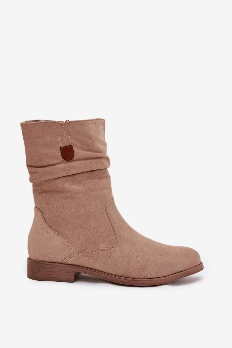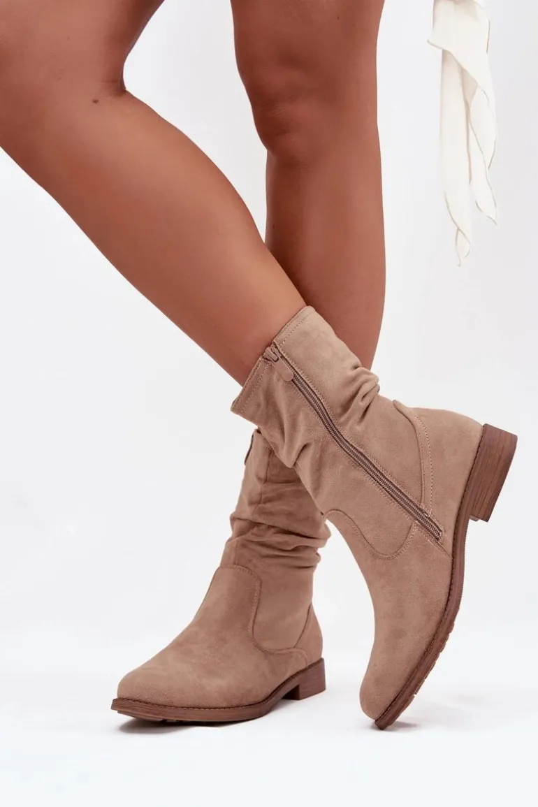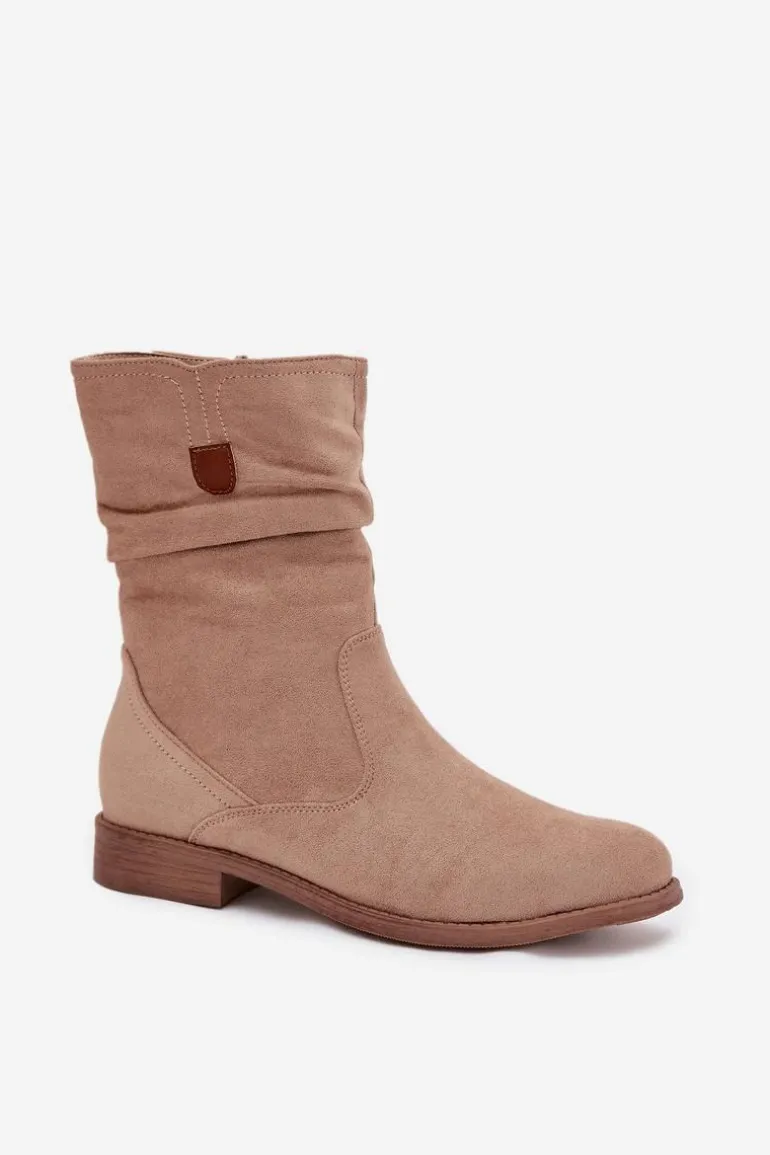 Ocieplane Botki Damskie Z Marszczoną Cholewką Na Płaskim Obcasie Beżowe Krisia