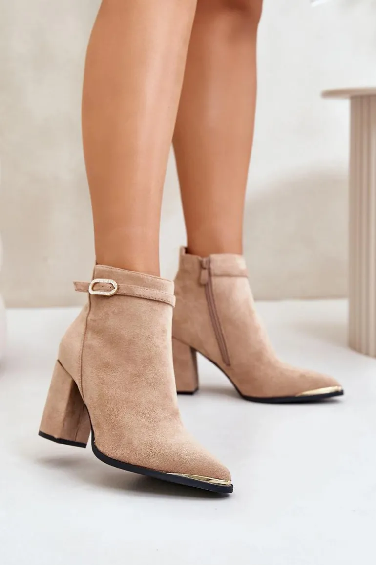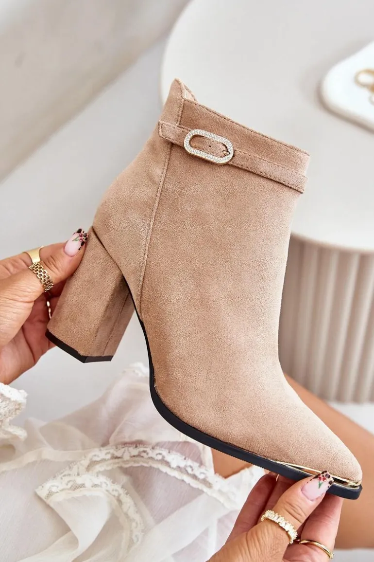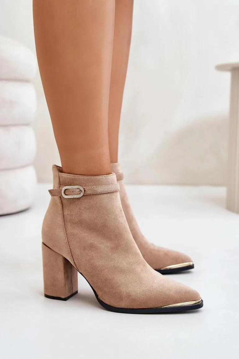 Botki damskie wykonane z miłego w dotyku eko zamszu. Osadzone na obcasie w formie słupka. Zapinane na zamek. Noski w szpic optycznie wysmuklą nogi. Usztywniony zapiętek zwiększy stabilizację stopy. Środek ocieplony kocem obuwniczym zapewni ciepło w chłodniejsze dni. Model ten wyróżnia się złotymi elementami, które nadają elegancji! Przy wyborze rozmiaru prosimy sugerować się tabelą rozmiarów.