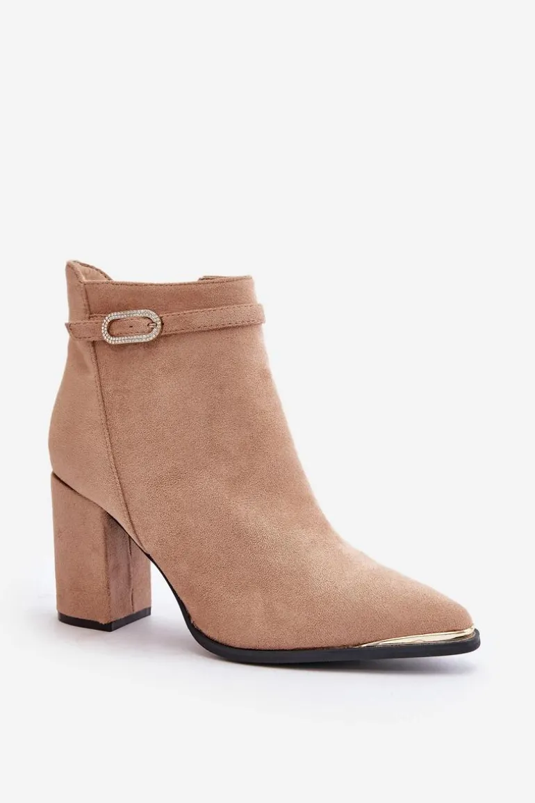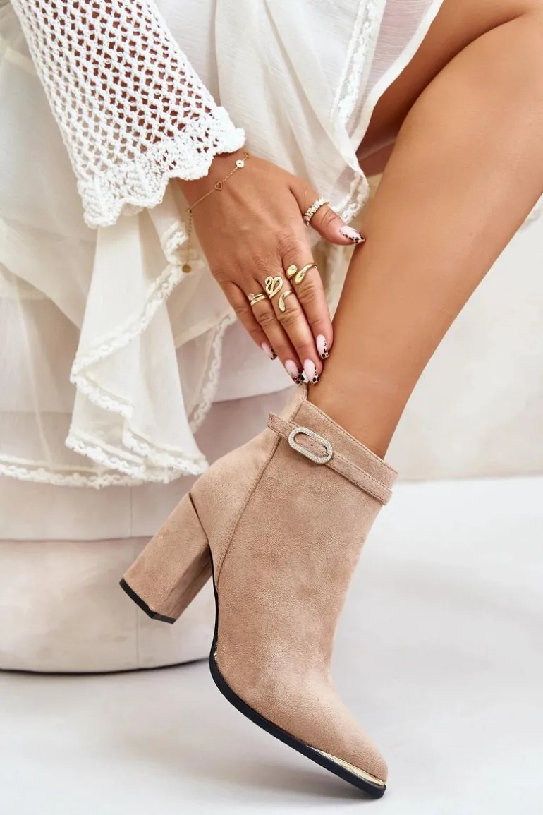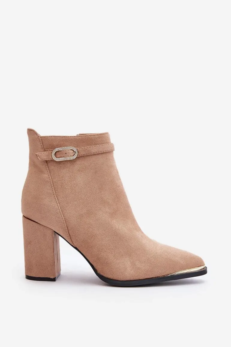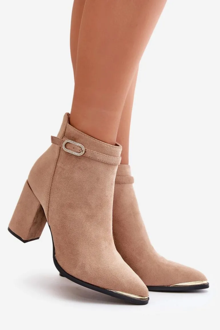 Botki damskie wykonane z miłego w dotyku eko zamszu. Osadzone na obcasie w formie słupka. Zapinane na zamek. Noski w szpic optycznie wysmuklą nogi. Usztywniony zapiętek zwiększy stabilizację stopy. Środek ocieplony kocem obuwniczym zapewni ciepło w chłodniejsze dni. Model ten wyróżnia się złotymi elementami, które nadają elegancji! Przy wyborze rozmiaru prosimy sugerować się tabelą rozmiarów.